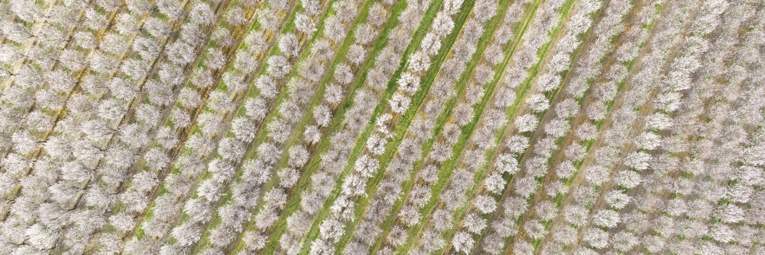 From high above Central Valley, California, almond trees in full bloom have the appearance of delicate pom poms. This overhead view shows the orchard’s hedgerow configuration and varying tree pattern.
