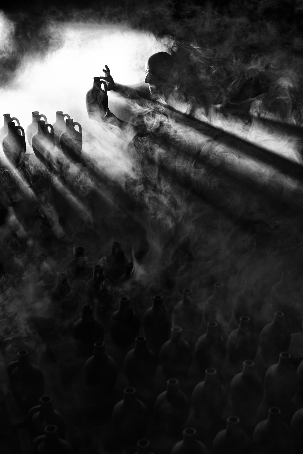 In this surreal dance of contrast, the potter emerges from the shadows, his gesture echoing through rows of clay vessels. The visual tension between light and smoke conjures a sense of timeless creation—a meditation on the relationship between maker and medium