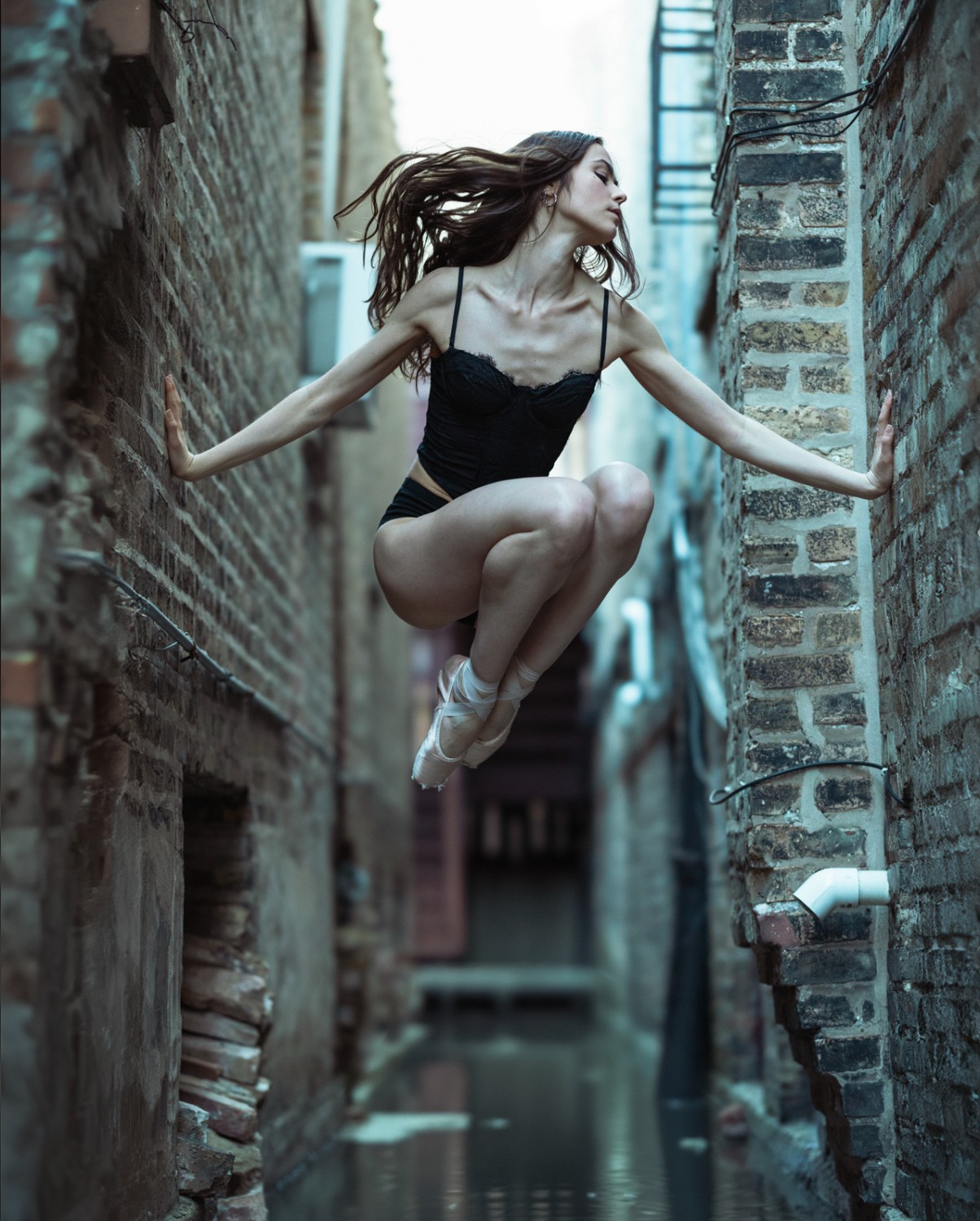 Suspended between two brick facades in a narrow flooded alley, a dancer holds the impossible—midair tension, grace without ground. In a space built for confinement, she dares to carve movement, stillness, and control, using the city’s decay as her stage.