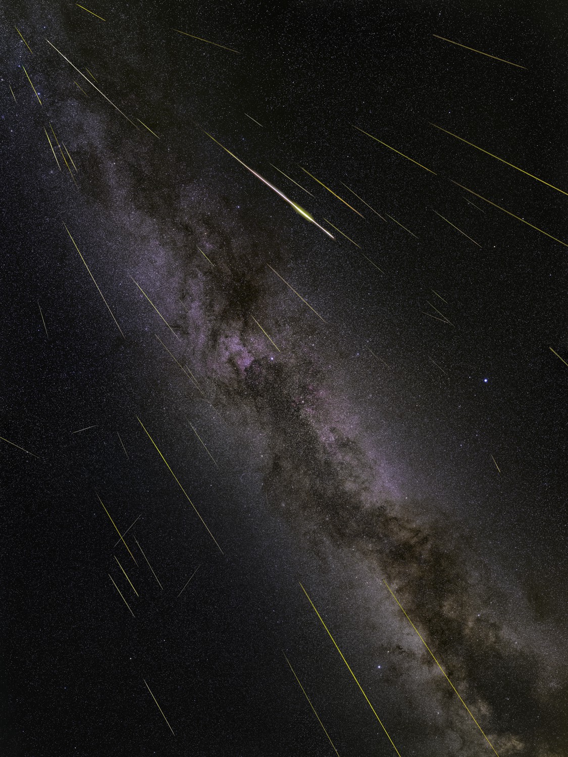Meteors from the Perseid shower streak through the night sky; the shooting stars almost perfectly aligned with the Milky Way. The angles of the meteors emerging from their radiant point evoke star trails familiar from science-fiction starships moving at warp speed.