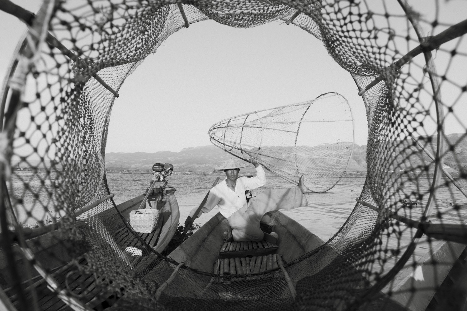 Taken from within the net, its depth frames the moment like a soft tunnel. The fisherman sits, frozen in an artistic pose, one hand gripping the net. He's part of something still and timeless, like art captured motion.
