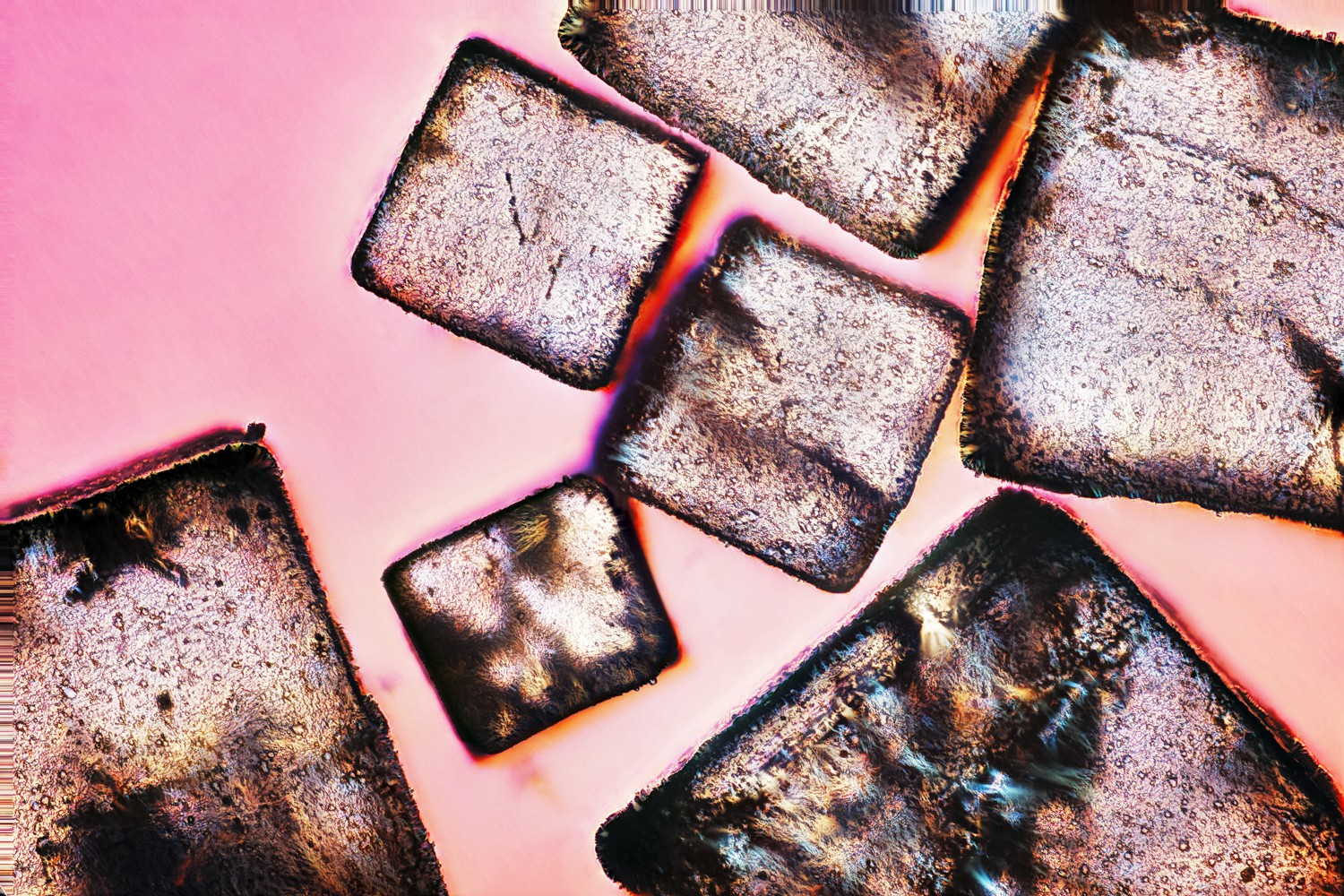 What may appear at first glance to be ice cubes are actually grains of salt viewed at high magnification. Salt crystals tend to be cubical or cubic-based pyramids due to the chemical structure of sodium chloride, the primary constituent of table salt.