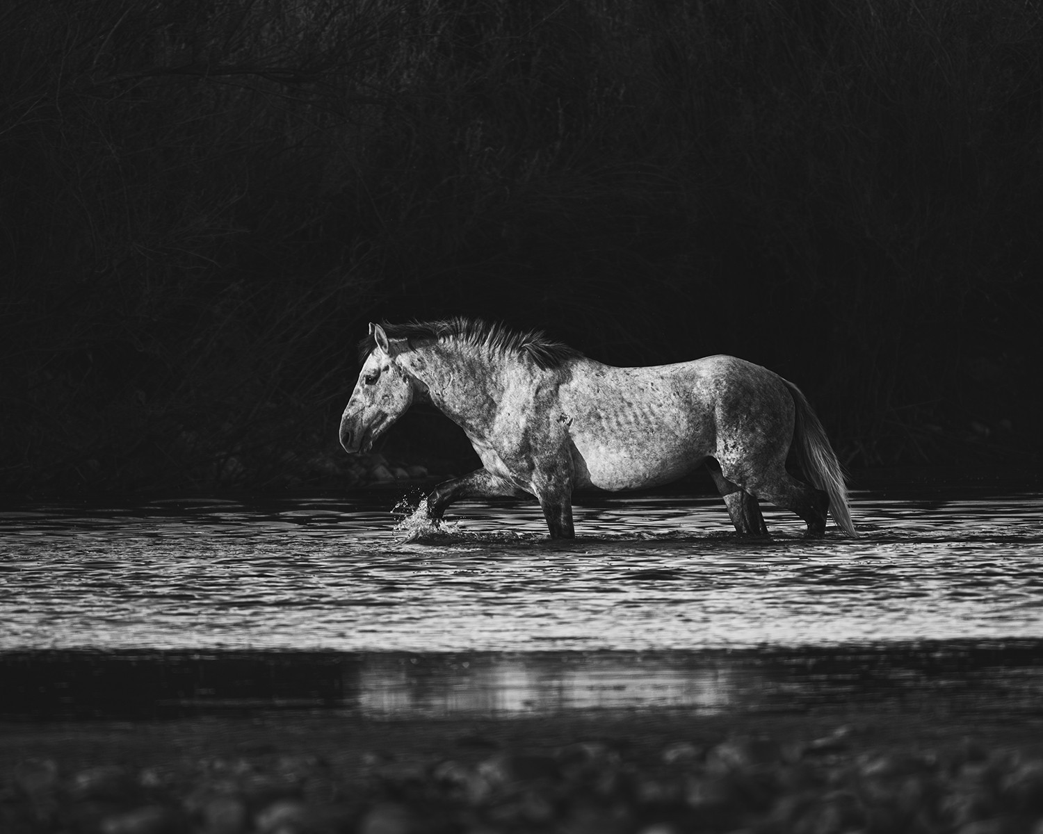 A wild stallion moves through the river with unwavering focus - fearless, steady, and sure. Each stride cuts through the current, a portrait of raw determination and wild purpose, as if nothing could stand between him and the path ahead.