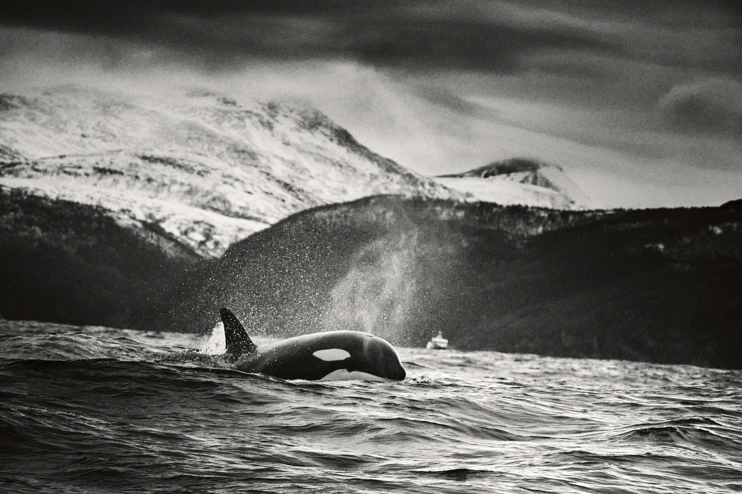 An orca takes a deep breath after surfacing in the Norwegian northern fjords.