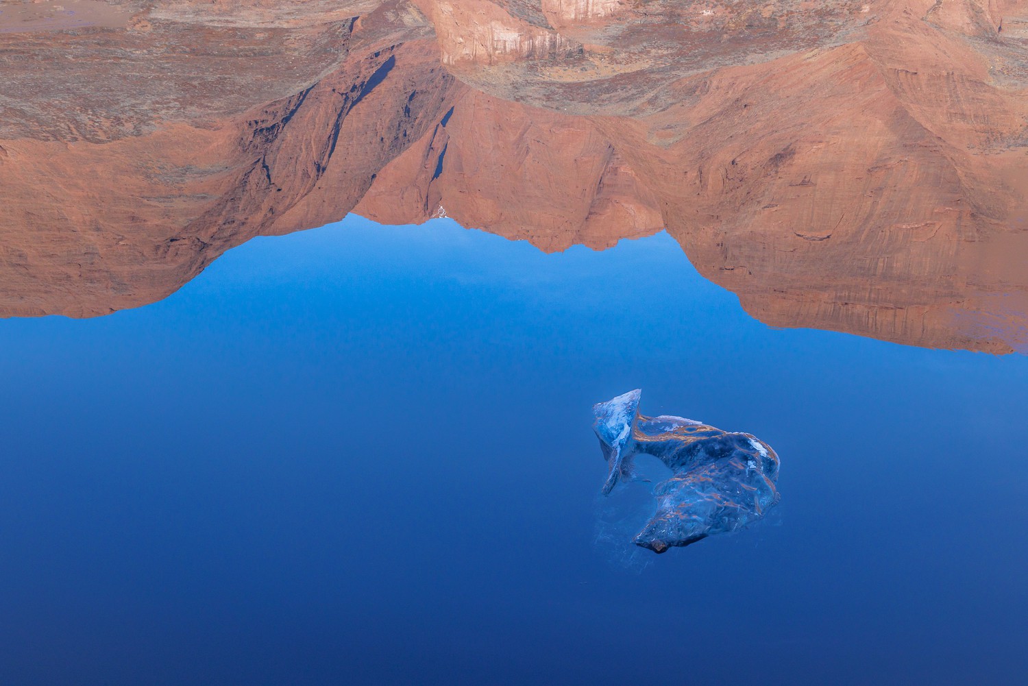 A piece of ice floats through the frame of an inverted reflection. The red mountain is upside down, perfectly duplicated by the crystal clear reflection. I composed the image so that the ice is the only physical element in the image and everything else is reflection.