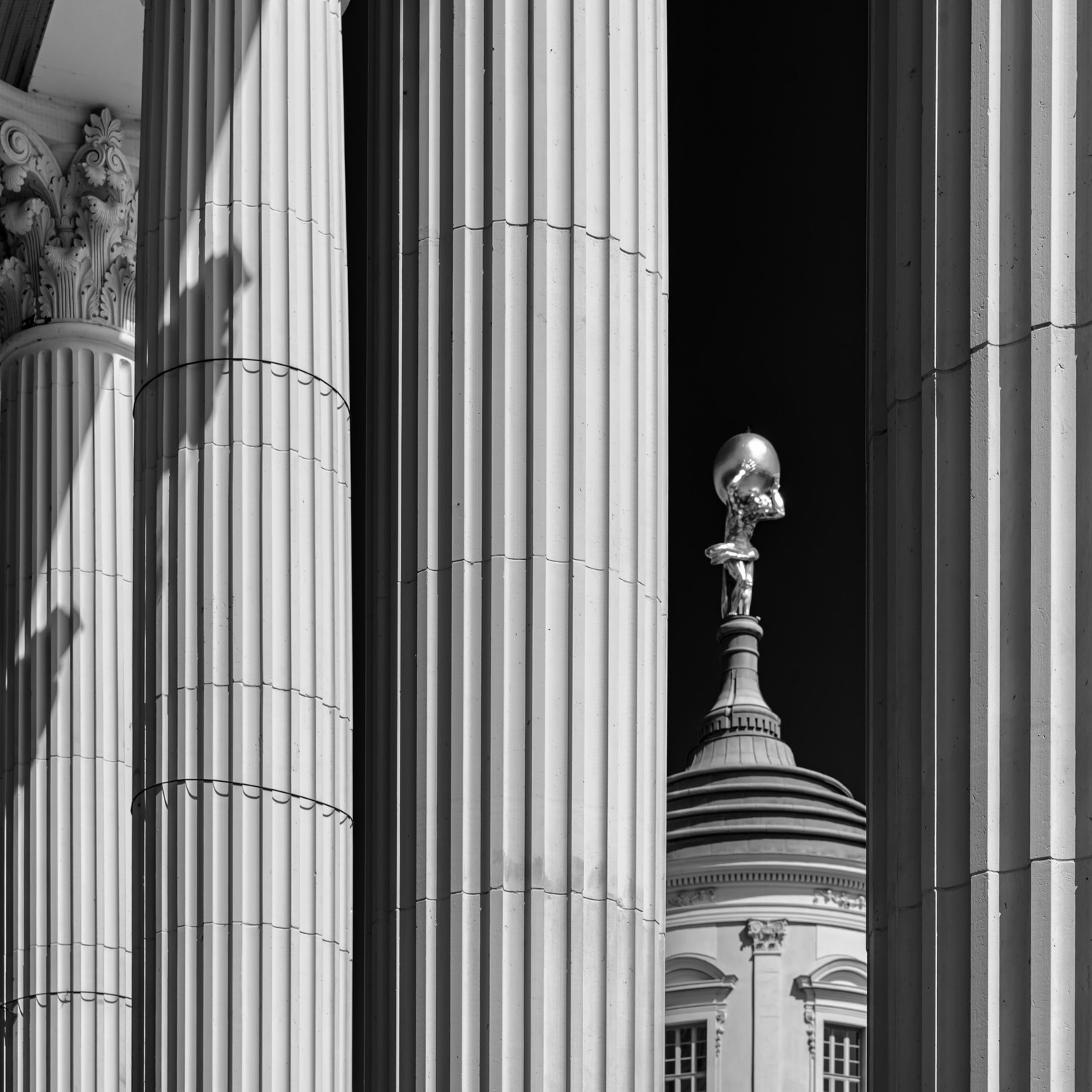 A view through the row of columns at the Nikolaikirche in Potsdam, Germany.