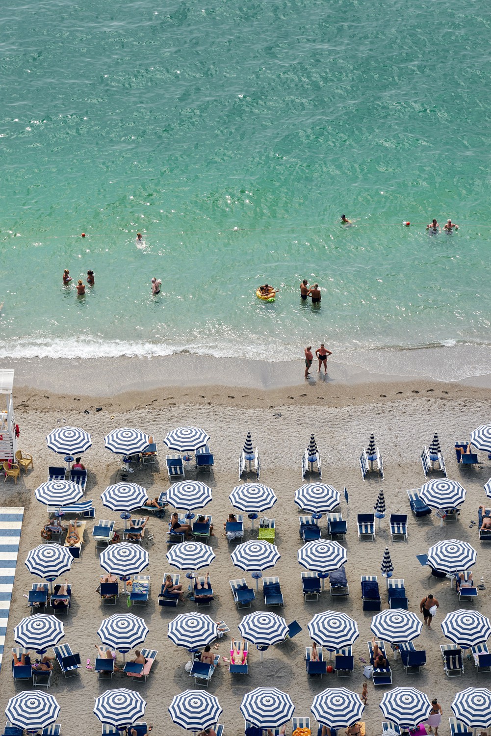 A classic Italian beach club on an August afternoon, with aquamarine colors of the Mediterranean contrasting with the navy blue of the beach umbrellas.