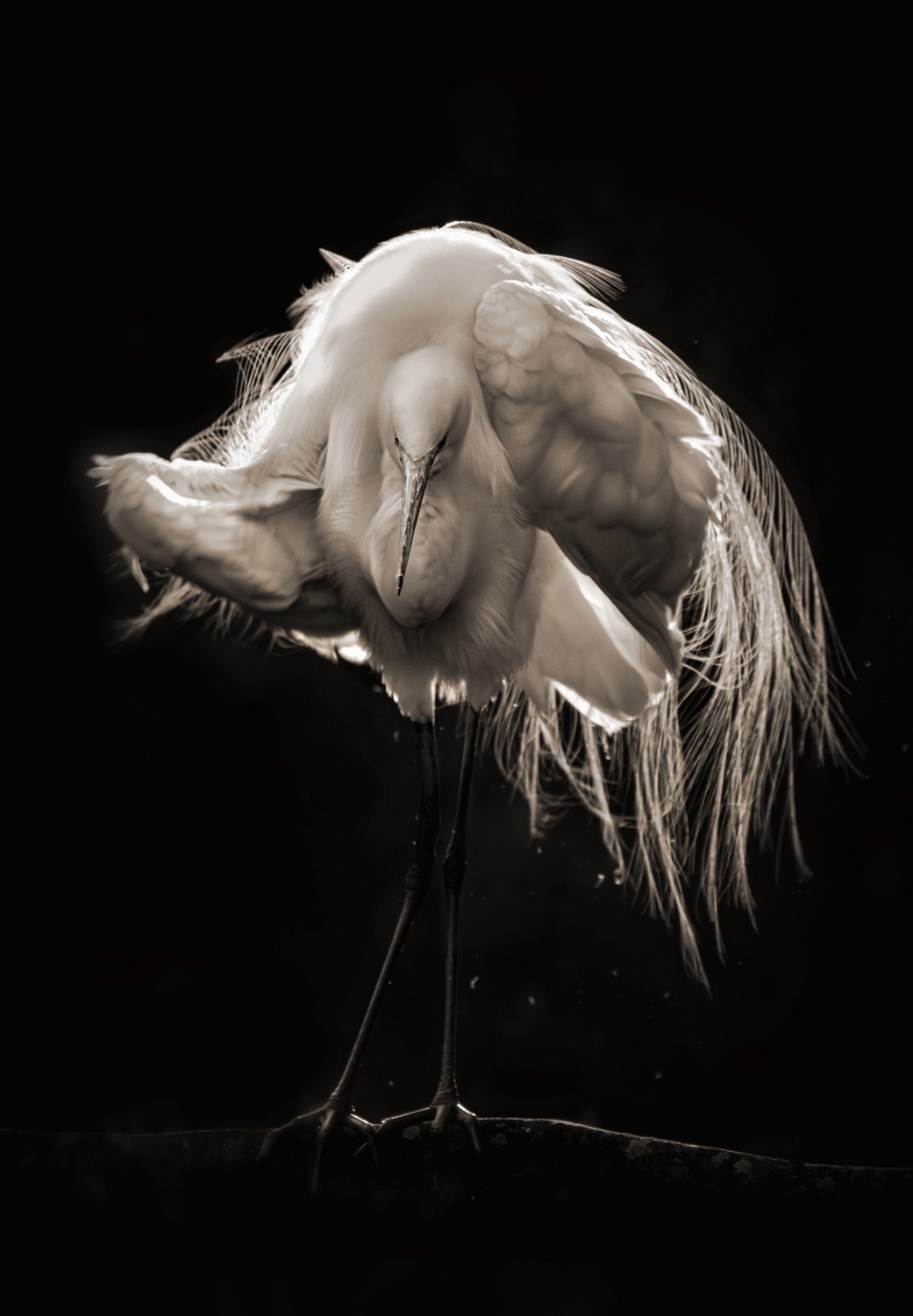 A Great Egret with its mating plumage shakes its aigrettes after preening at Bombay Hook NWR. It is perched in a narrow band of densely-covered swamp, spotlit by the rising sun through the branches. Thankfully, the bird was near the edge of the tree-cover for some indirect light on its face.