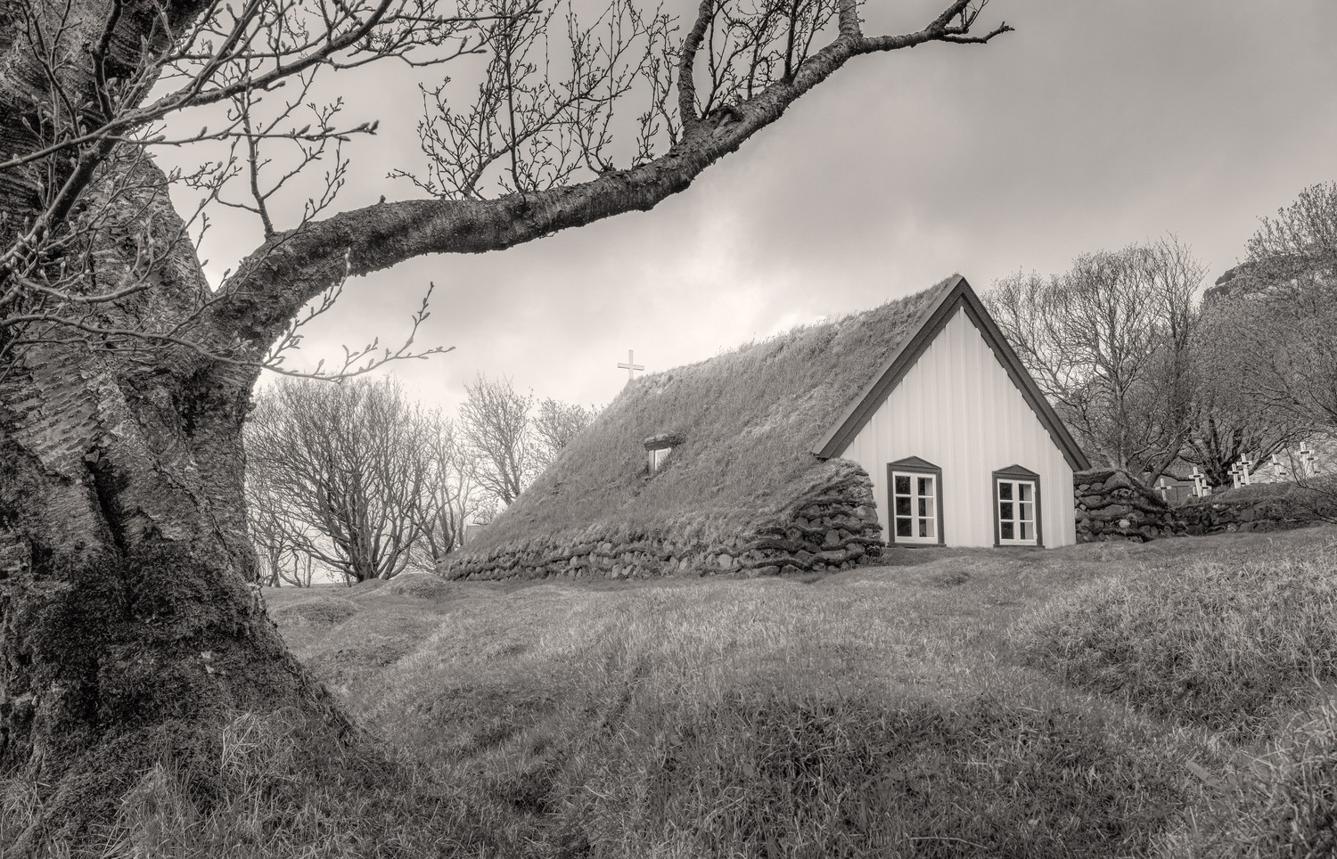 A traditional sod church, one of a handful left in Iceland. The composition was done in the style of illustrator, NC Wyeth.