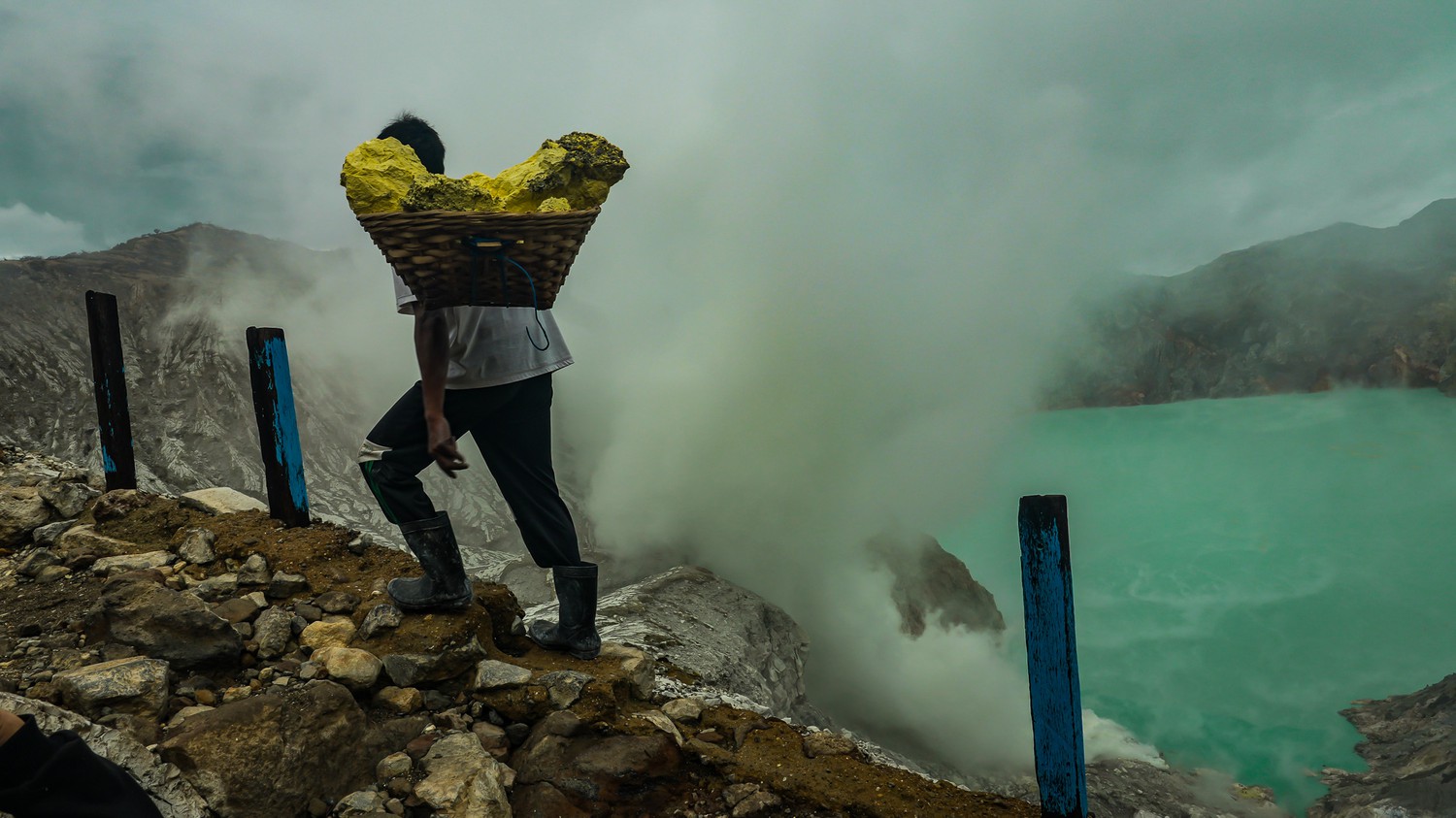 A miner carries sulfur from the craterous lake of sulfuric acid atop volcanic Mt. Ijen. Sulfur mining is one of the most hazardous jobs in the world, involving back-breaking labor for little pay and exposure to hazardous fumes. A single misstep into the lake could cost you your life.