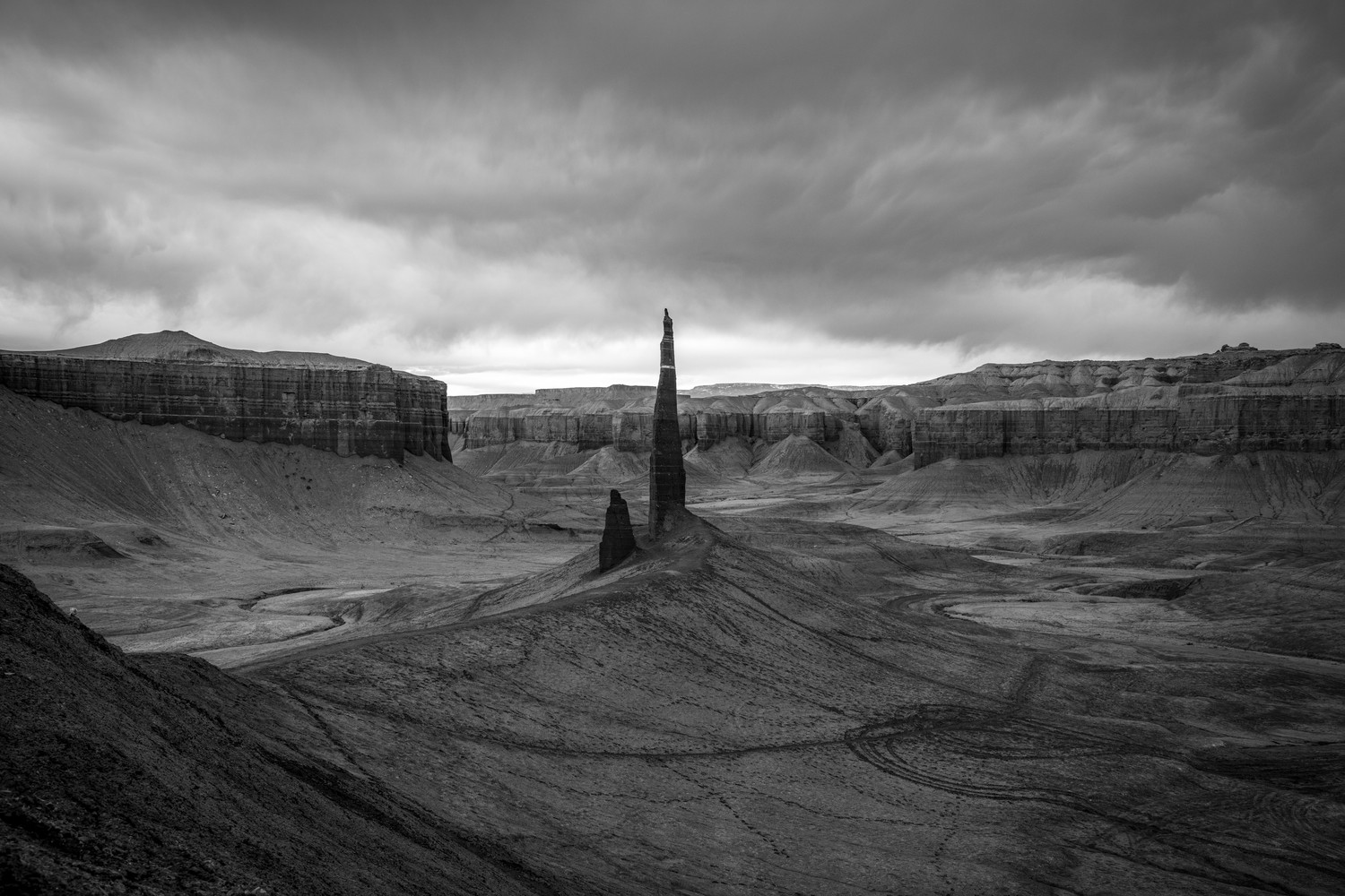 A tall pointy spire rises above the desert landscape towards the stormy sky.