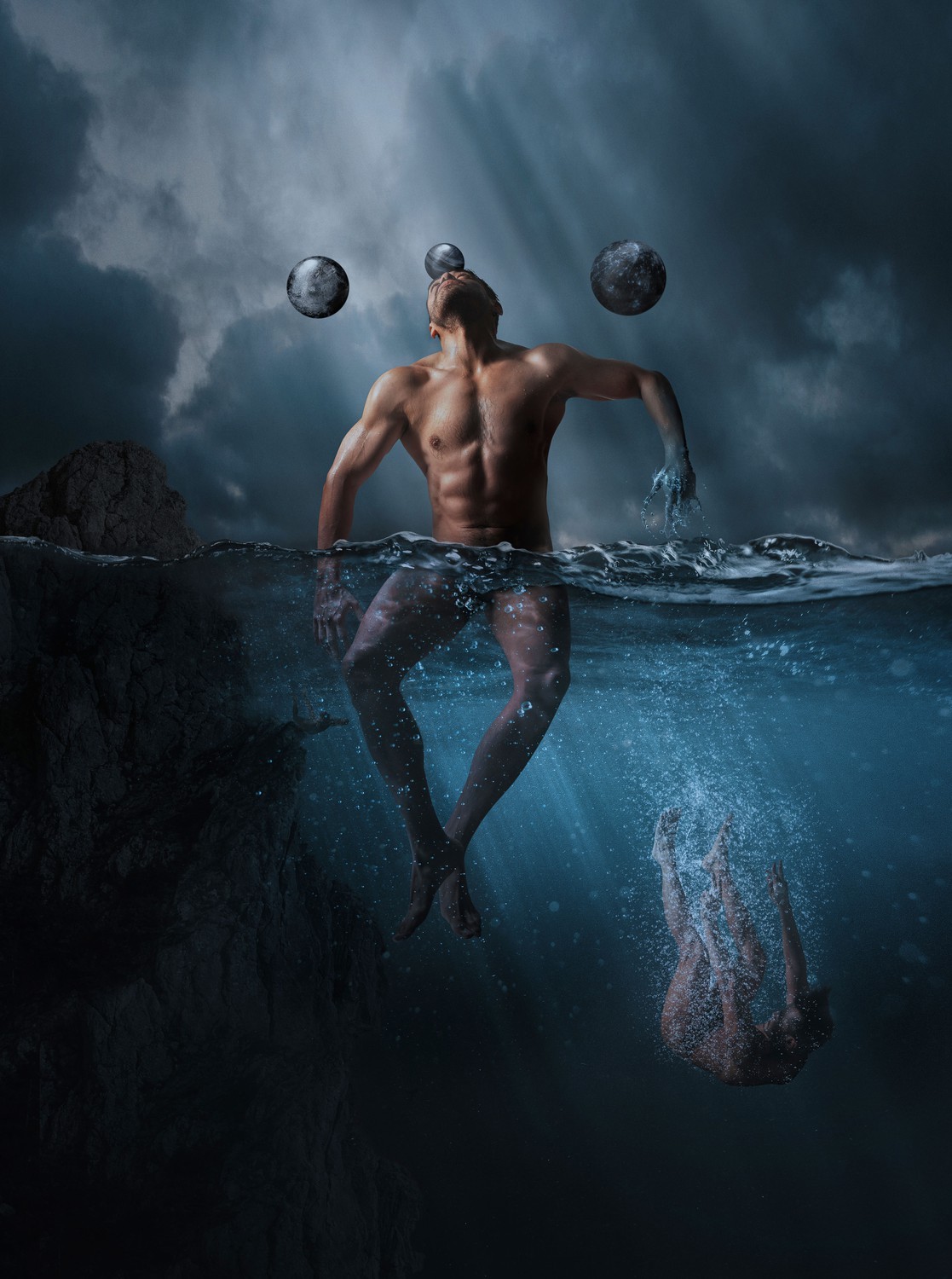 A body turning into water or, vice versa. The states of matter transitioning. Matter is not destroyed, it is in constant change and all phenomena are in a state of flux. The images are the result of the integration of various photos that are digitally mixed to create this surrealistic scene.