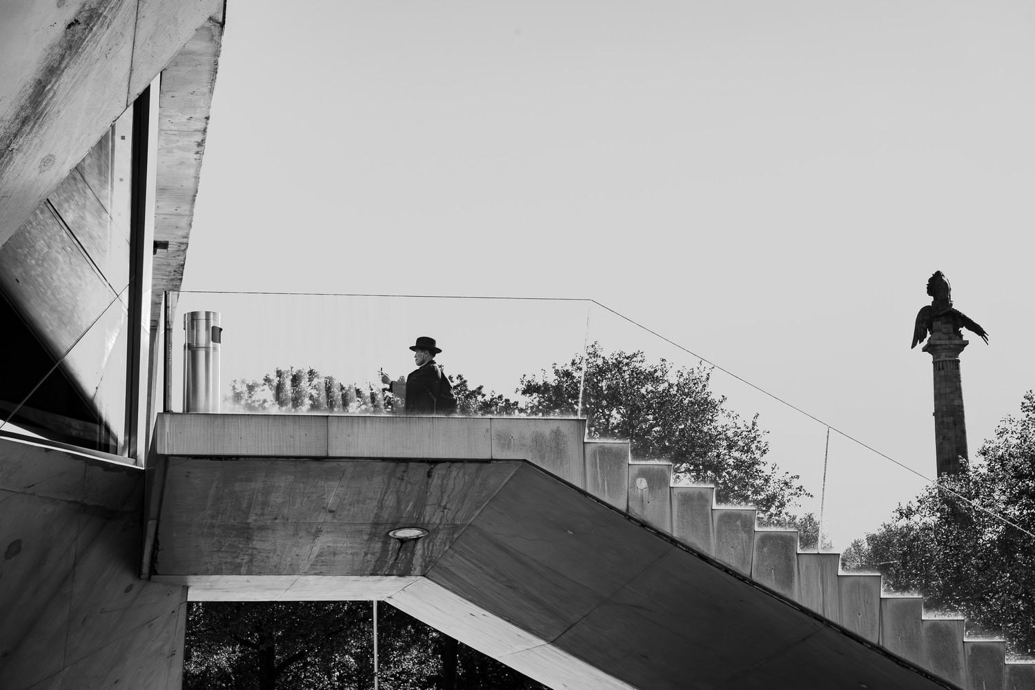 connection between modern architecture and the classical figure, evoking the passage of time and the dialogue between the past and the present in the scene.