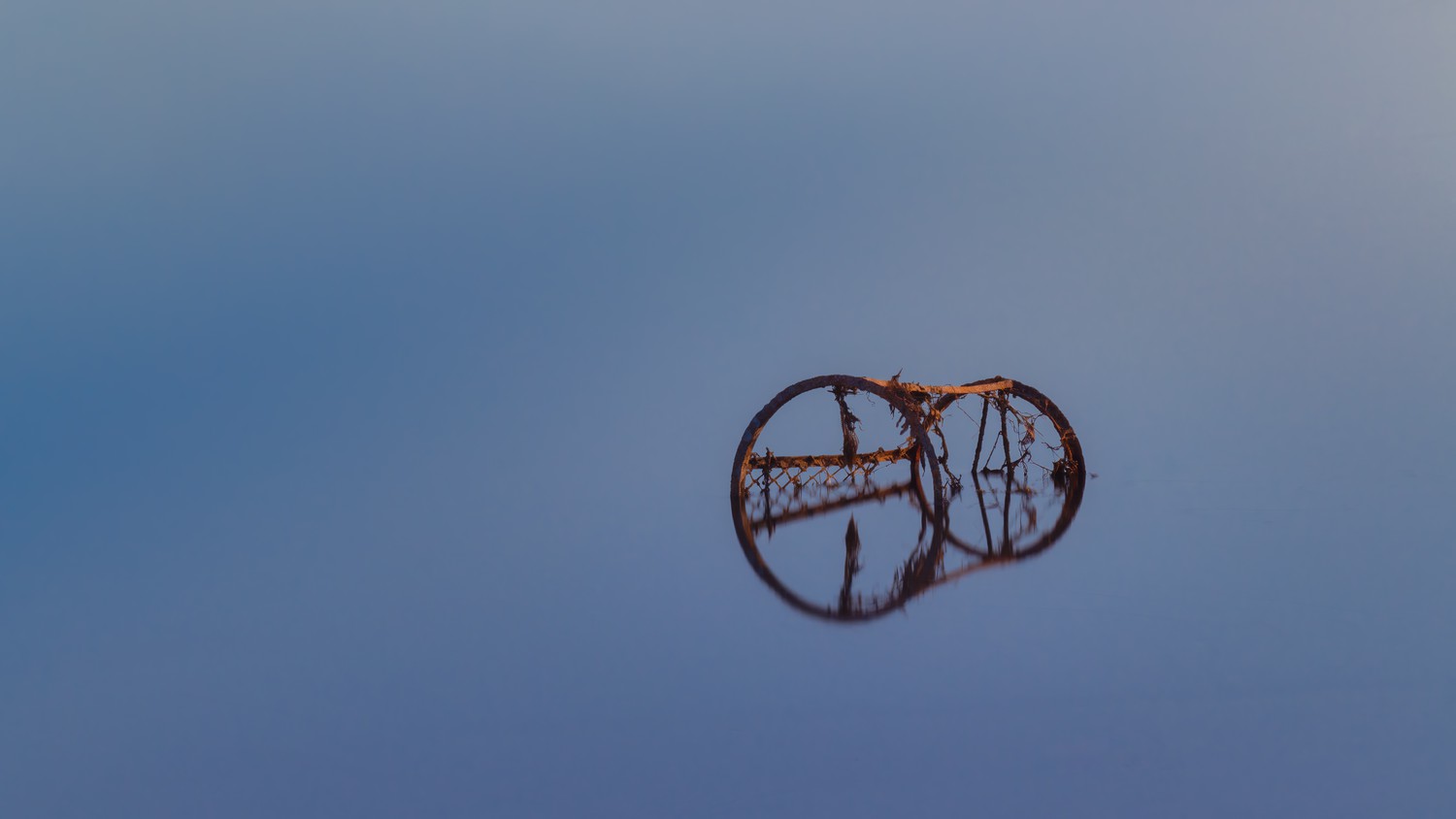 The skeleton of a former New York City street corner trash can lies in a tidal lagoon, revealed twice a day at low tide.