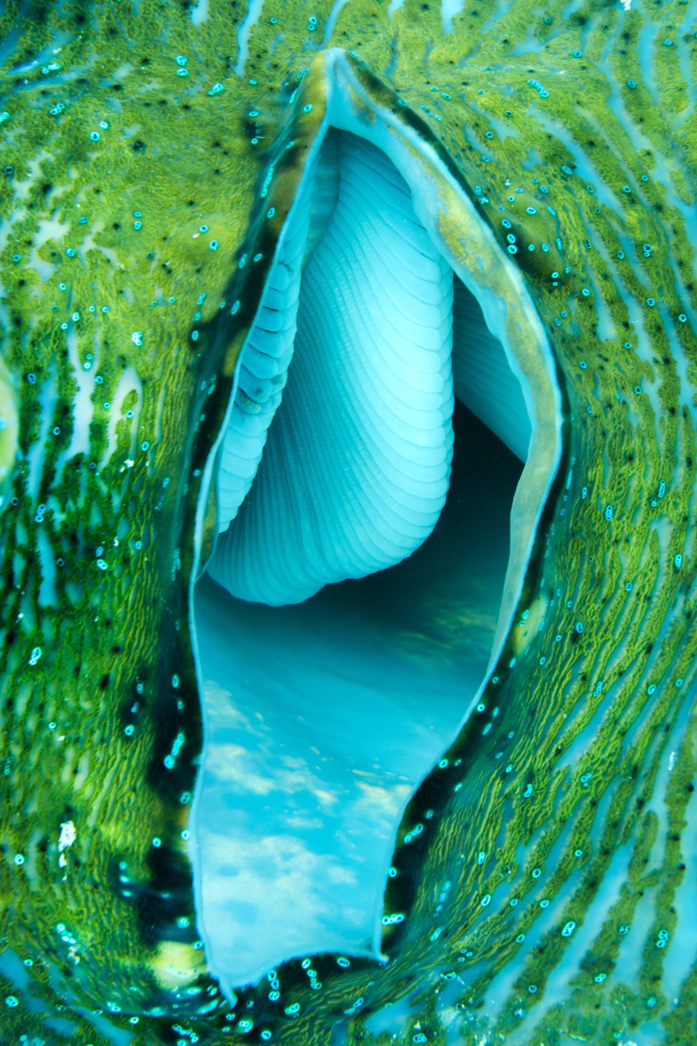 A close-up of a giant clam's vibrant mantle, its folds opening like a portal to another universe. Photographed in a clam sanctuary in Raja Ampat , this living organism photosynthesises sunlight, offering a glimpse into the ocean's mysteries.