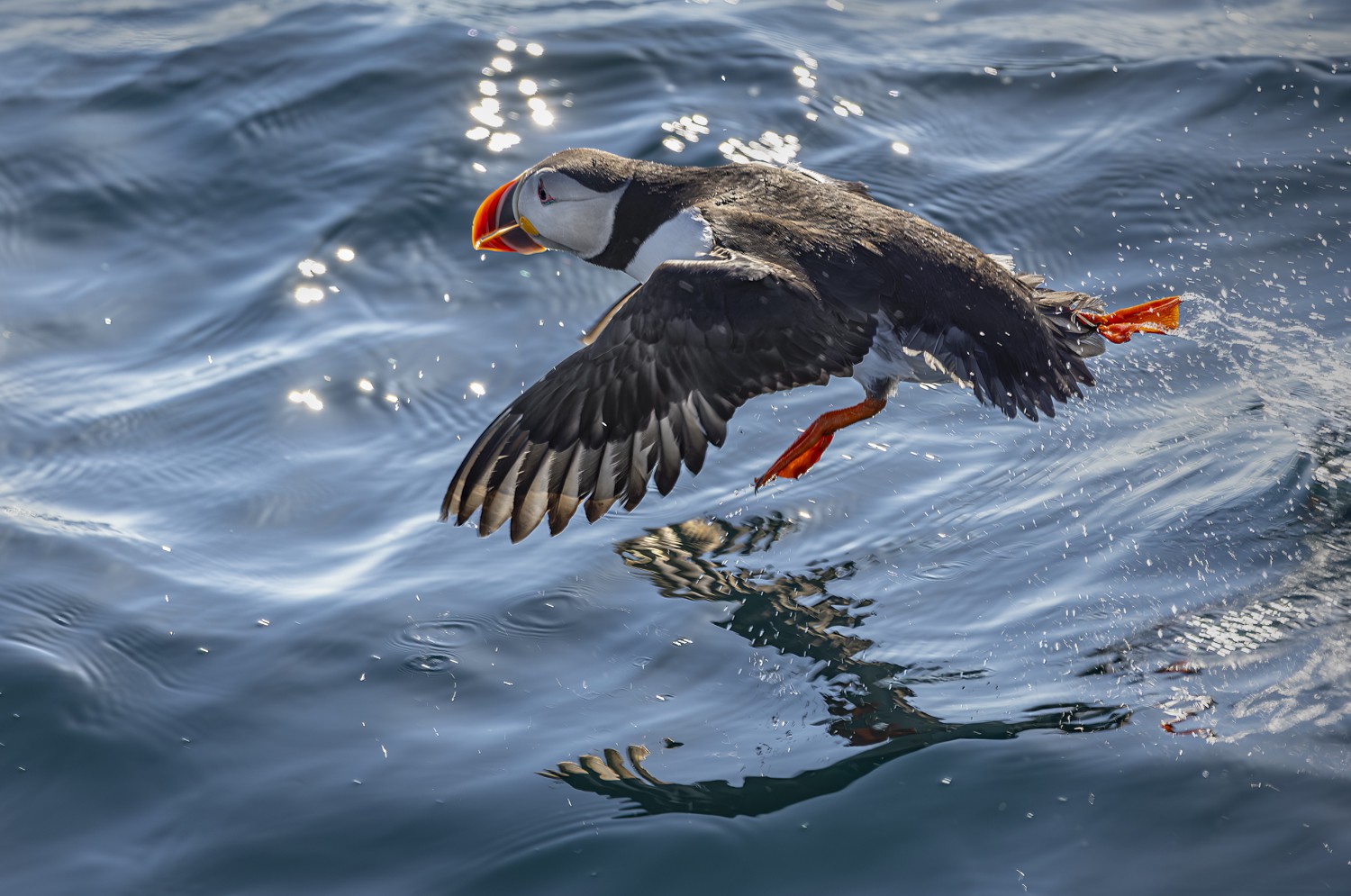 Puffins can’t run on water, but this image might make you think otherwise! This puffin was photographed as it took off from the water. As it flew, its wings flapped furiously and its feet struck the water, making it look like a world-class sprinter.