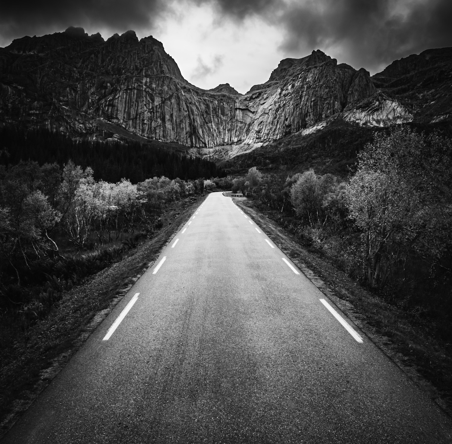 The winding road and towering peaks of the Lofoten mountains are some of the most spectacular landscapes in Norway. The road that leads to the cozy village of Nusfjord in this shot emphasizes dramatic tones and distinct mood.