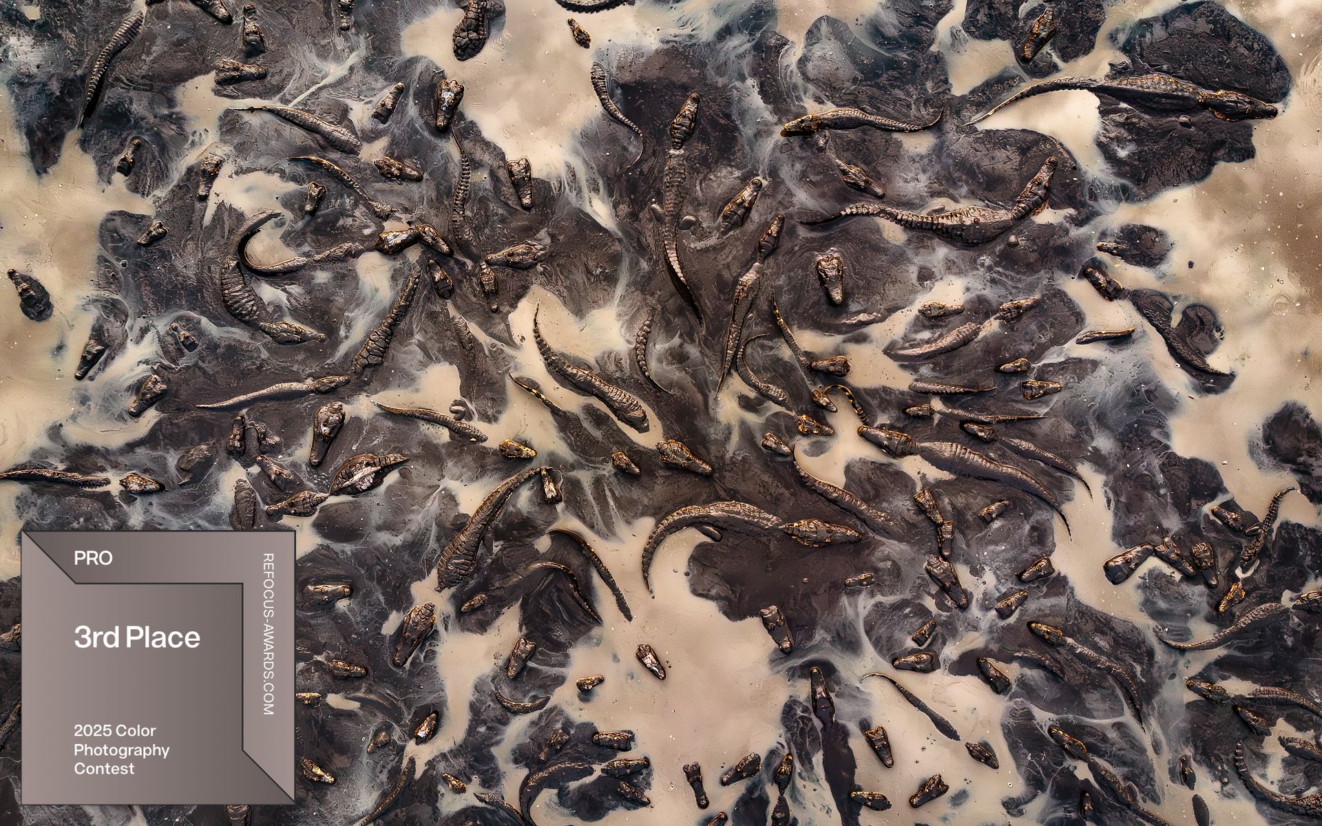 The photo was captured using a drone, with the camera aimed straight down to emphasize the graphic quality of the scene. From that vantage point, the chaotic textures and swirling forms created by the caimans and the drying mud take on an almost abstract quality. That was precisely the effect I was aiming for—transforming a moment of harsh environmental reality into something that invites closer inspection. At first glance, viewers might see an abstract pattern or even a painting, but as they look more closely, the details begin to emerge, revealing the powerful story behind the image.