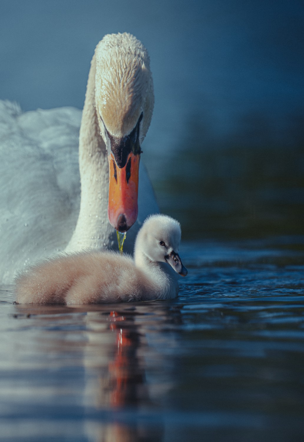 A newly hatched cygnet floating peacefully under its parent's watchful eye. A parent’s watchful eye and a tiny fluffball learning to float through life. Just look at that curious gaze toward the camera.