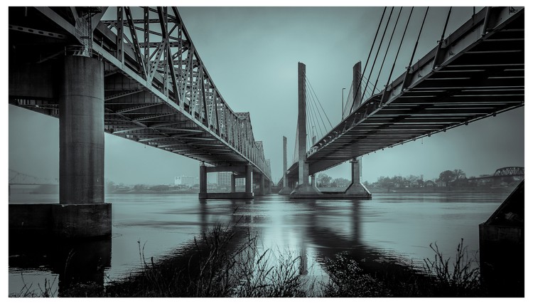 Some bridges over the nearly mile wide Ohio River on a cold December day in Louisville Kentucky