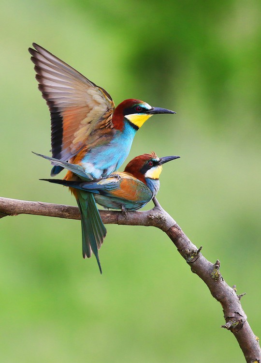 Bee-eater mating involves a courtship display that includes aerial maneuvers and nuptial gifts of prey, such as a disarmed bee or dragonfly.