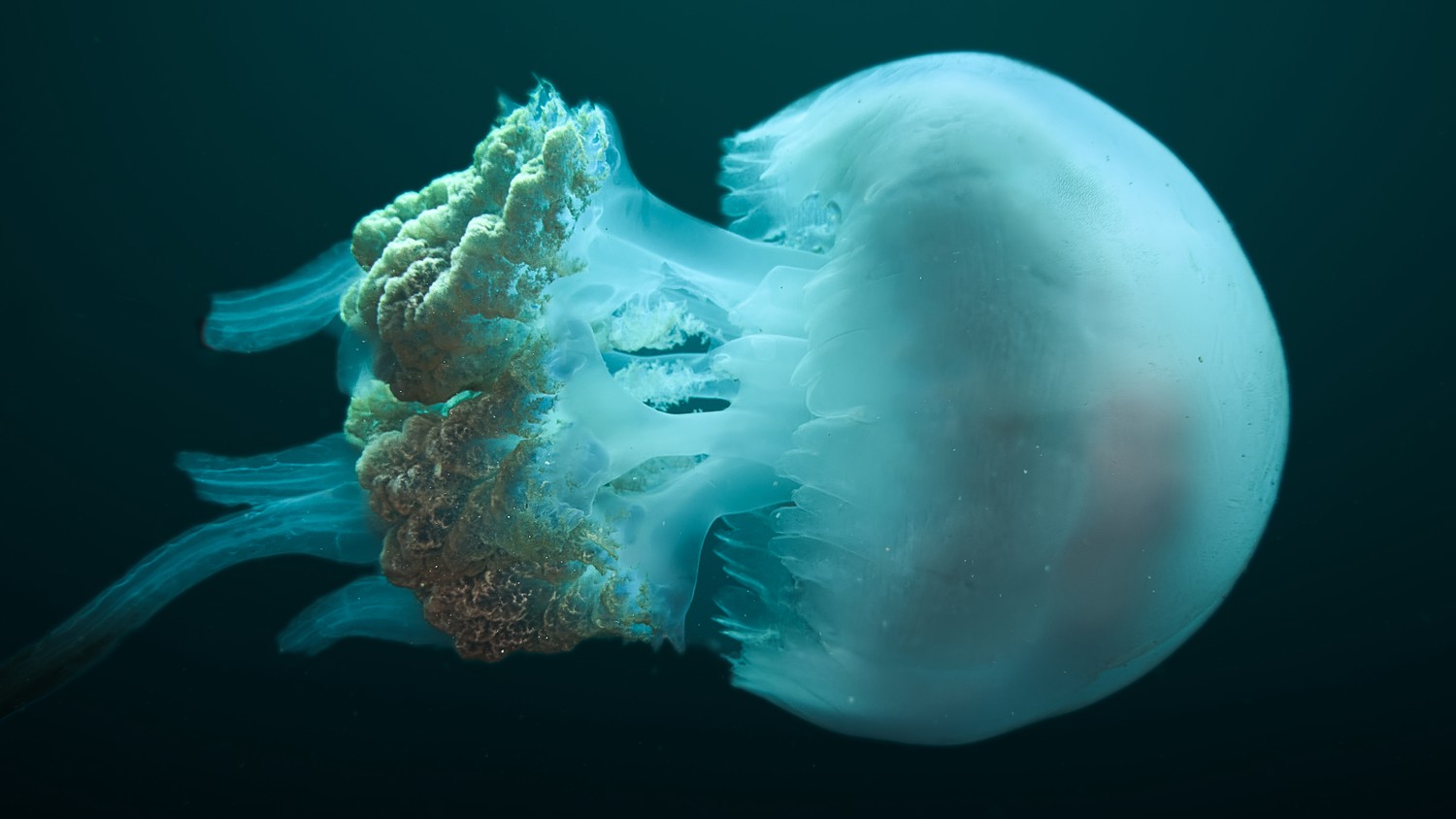 A Rhizostoma luteum drifting through the Atlantic light near Sesimbra. The stillness of its form turns movement into meditation - a silent presence suspended in blue.