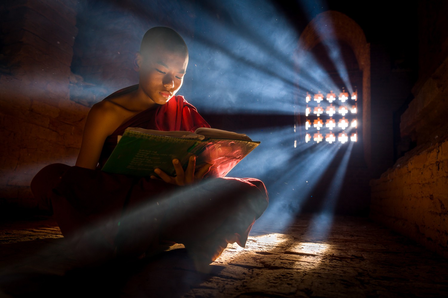 A novice monk studies a book under the sunlight streaming in from the window of a sacred temple in Bagan, Myanmar.In Myanmar, books and learning are vital for young monks, who begin their education in monasteries from a young age.