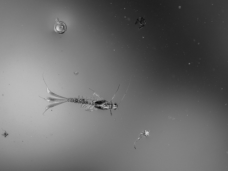 This unfortunate mayfly nymph died during emerge. The process requires a lot of energy and not all of them make it. I witnessed the struggles of this individual and I was genuinely sad when I saw its lifeless body. The photo reminds me of astronauts in space, floating into eternity.