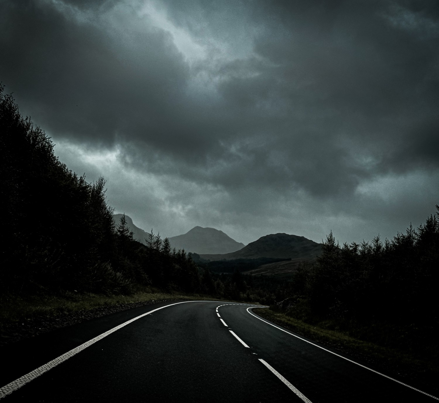 Taken through the windscreen while travelling in a Jeep along the winding Scottish West coast.
