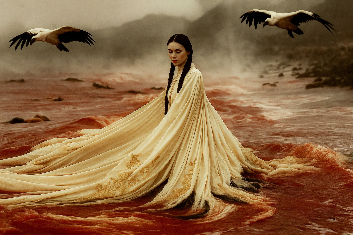 Balinese women in ornate ceremonial attire prepare for a religious procession. Their elaborate headdresses, made of gold-colored decorations and natural elements, symbolize beauty and devotion, while their presence highlights the community’s enduring attachment to ritual tradition.