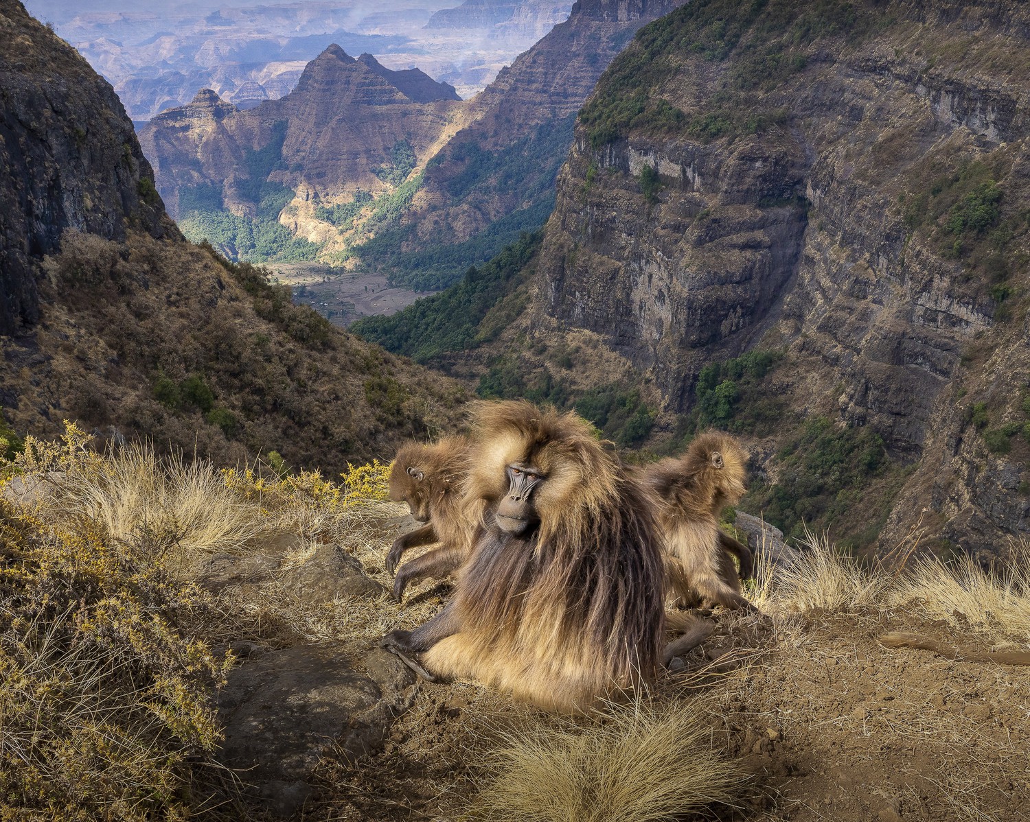 The gelada monkey is an iconic animal of Ethiopia's Simien Mountains. They spend the night on tiny ledges on the impossibly steep cliffs of these canyons to protect themselves from leopards, and climb back on the plateau at daybreak to graze all day because this grass is not nutritious.
