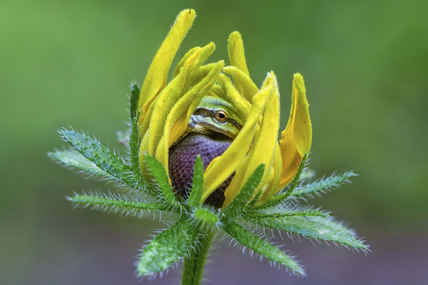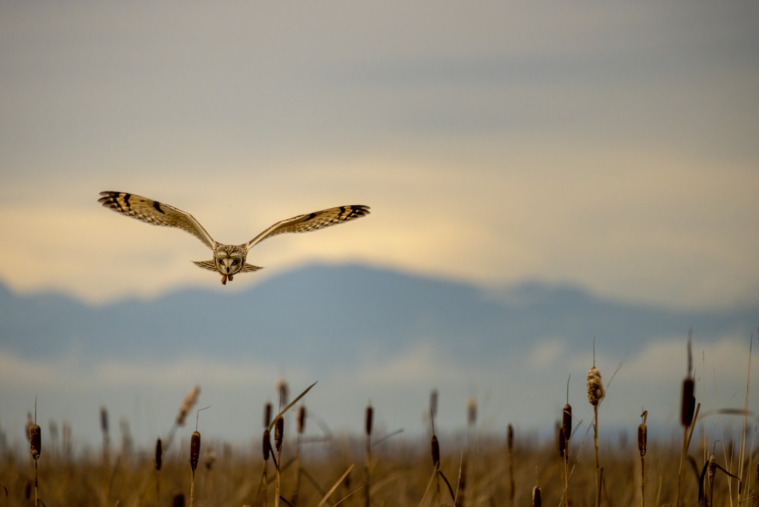 A short-eared owl flies silently over the marsh land on the west coast of British Columbia.