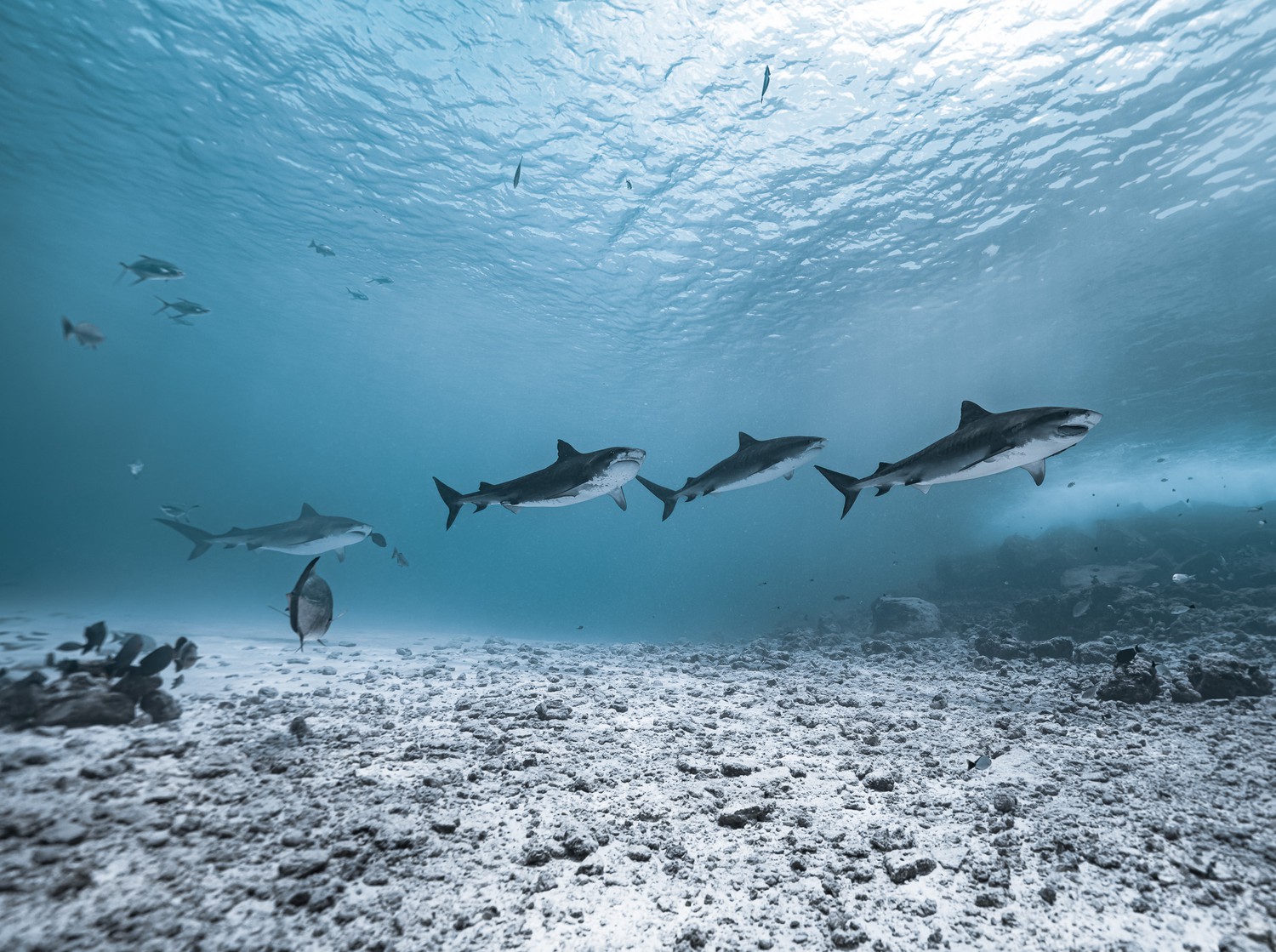 In perfect alignment, these predators reveal the reef's hidden choreography, where power and grace coexist beneath the waves. Their silent formation is a rare glimpse into the rhythm of the ocean, a world governed by instinct, balance, and the subtle discipline of survival.