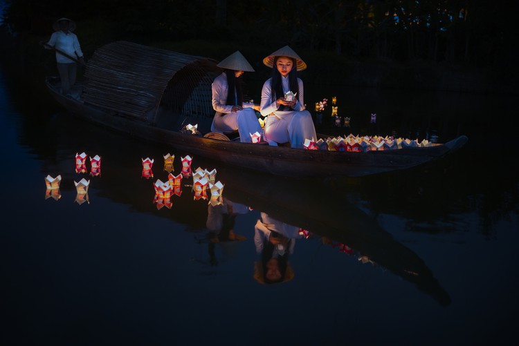 In the quiet of the night on the Nhu Y River in Hue two young women in traditional Vietnamese conical hats and dresses place candles in the water to offer prayers for health and good fortune