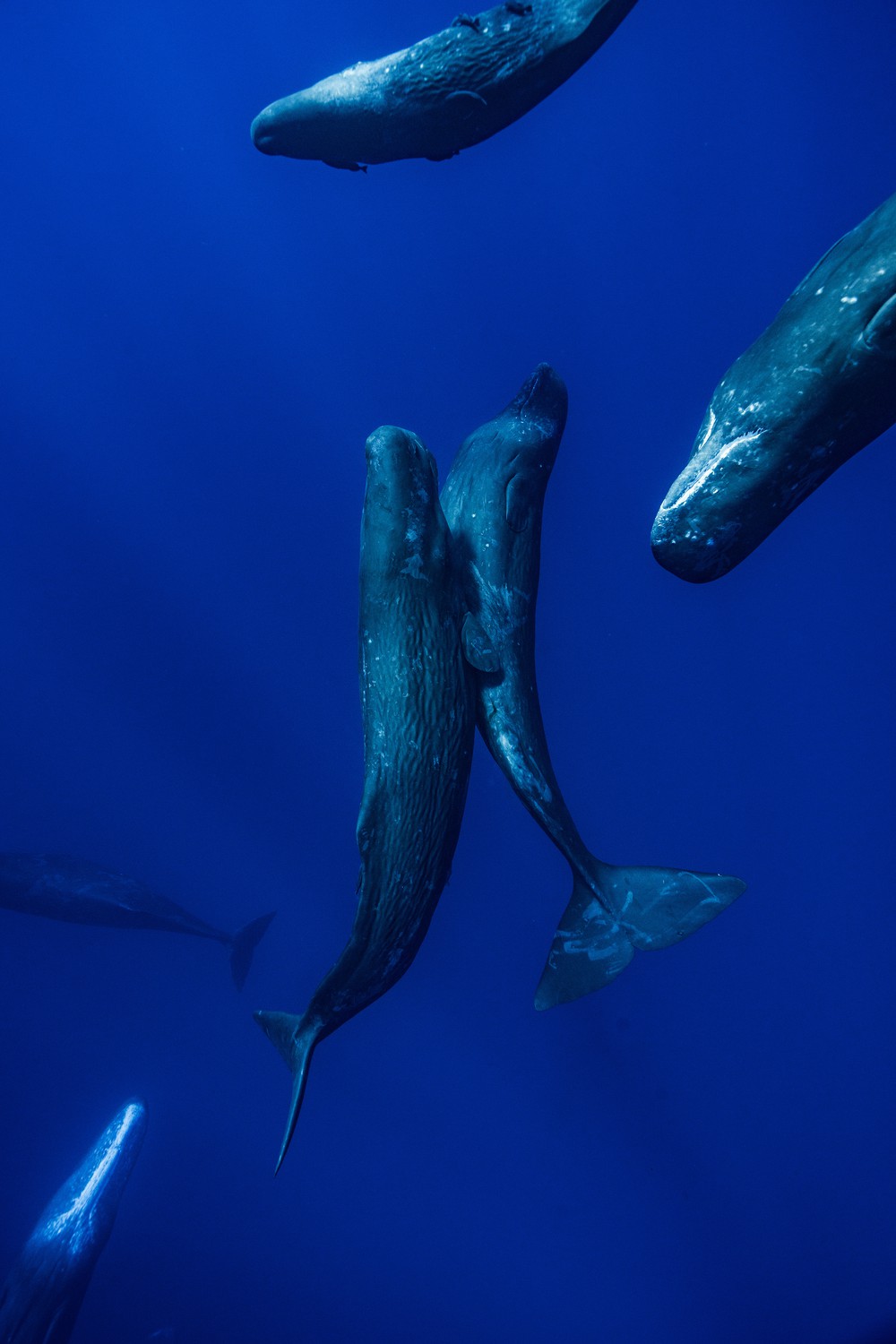 two sperm whales rub bellies playing around below us, when several others swim over to come and play, helping to create these leading lines to the main two whales
