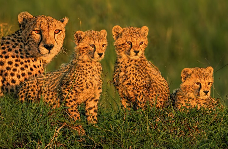 As the sun rose on the Masai Mara in Kenya as a female cheetah was interacting with her three cubs. The cubs were romping around playing before they were called into line to teach them to sight and hunt game.