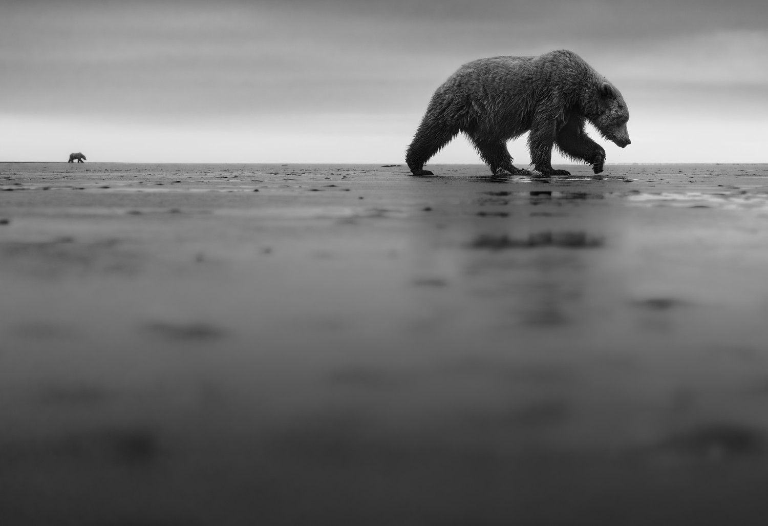 On Lake Clark's tidal flats, two bears cross the same path – one near, one distant. This moment speaks to our shared journeys: we move through life seemingly alone, yet others have walked before us and follow behind. Connection exists even in solitude, our footsteps creating paths for those to come.