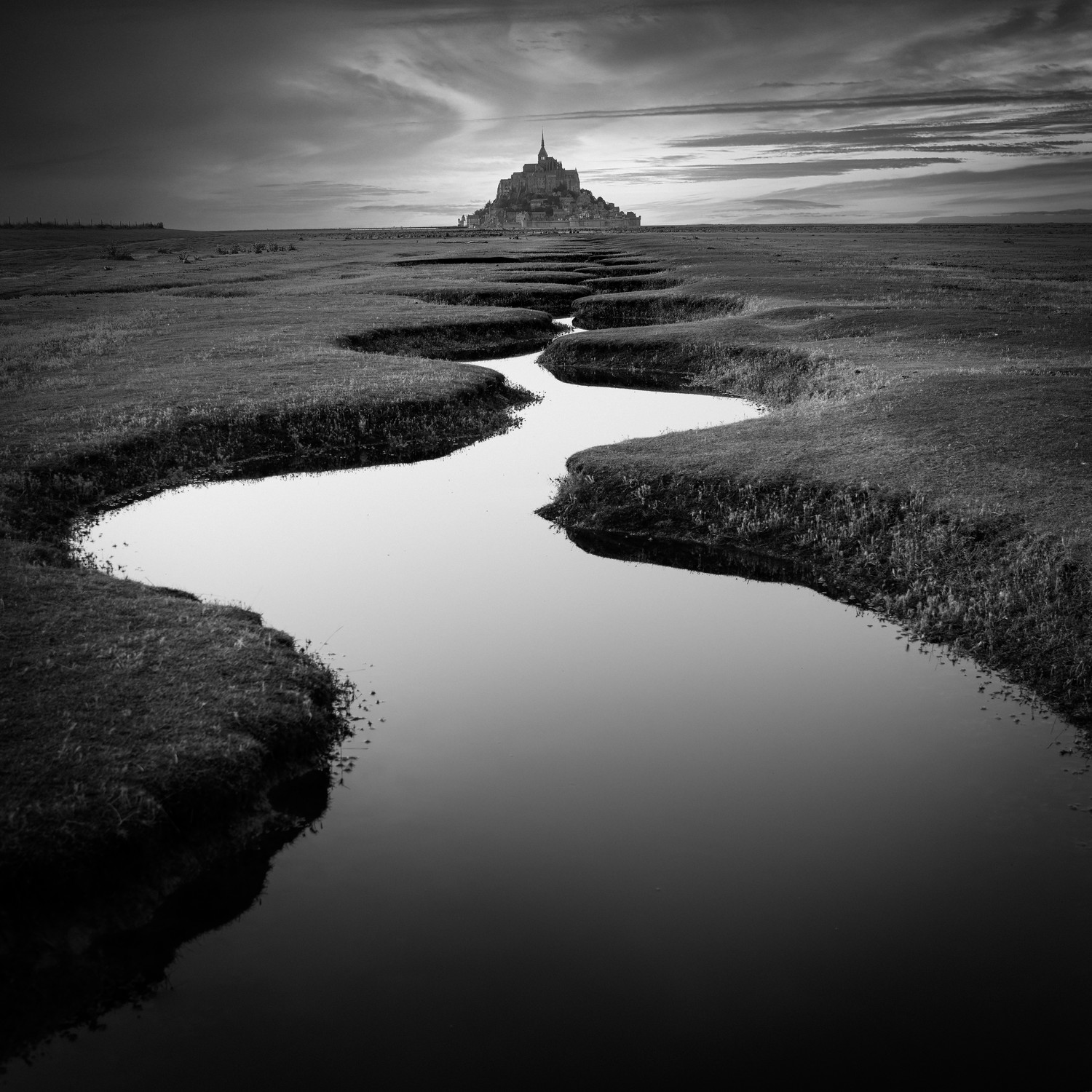 A winding stream leads the eye across the tidal flats toward Mont Saint-Michel, silhouetted against a dramatic sky. The black and white tones highlight the contrast between water, land, and horizon, evoking a sense of solitude and timelessness.