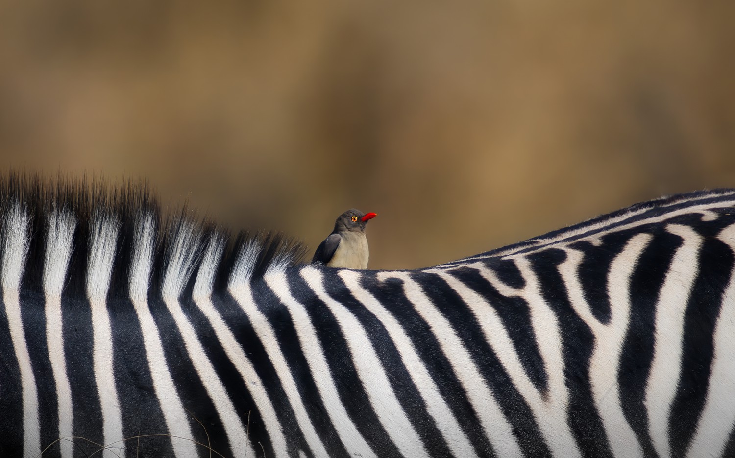A red-billed oxpecker peers over a plains zebra in the Okavango Delta. I photographed this bird early in the day, just after it landed on the far side of this zebra and walked to the top for a view. These birds feed by plucking ectoparasites, mainly ticks, from the hair and skin of large mammals.