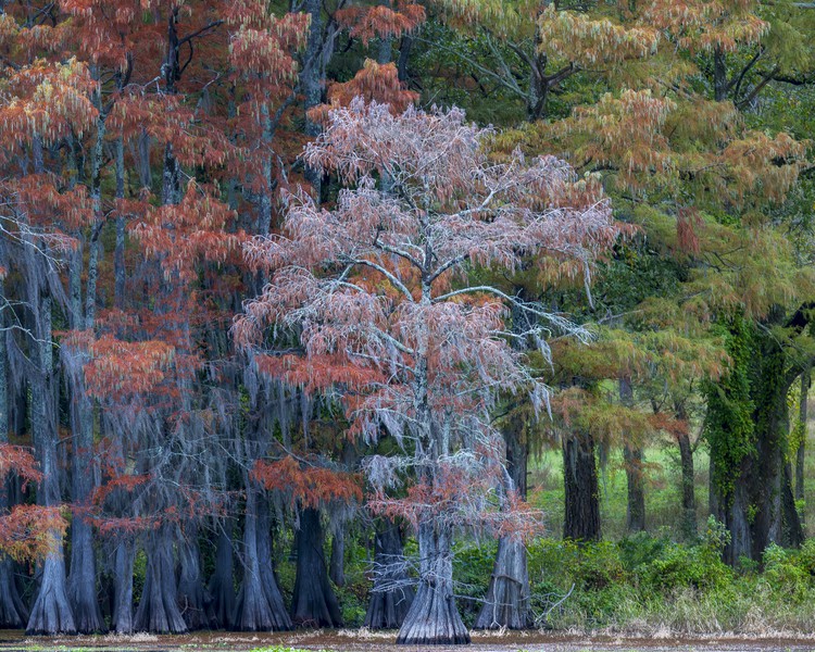 A silvery cypress forms a boundary between the seasons in the forest behind