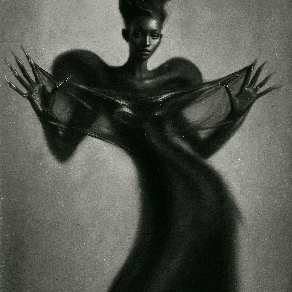 A witch in a red dress wanders into the light, and suddenly her presence multiplies. Shadows fracture into countless echoes, each suspended in air as if cast by an unseen spell. What begins as a solitary figure becomes a chorus of illusions, blurring the line between architecture and enchantment.