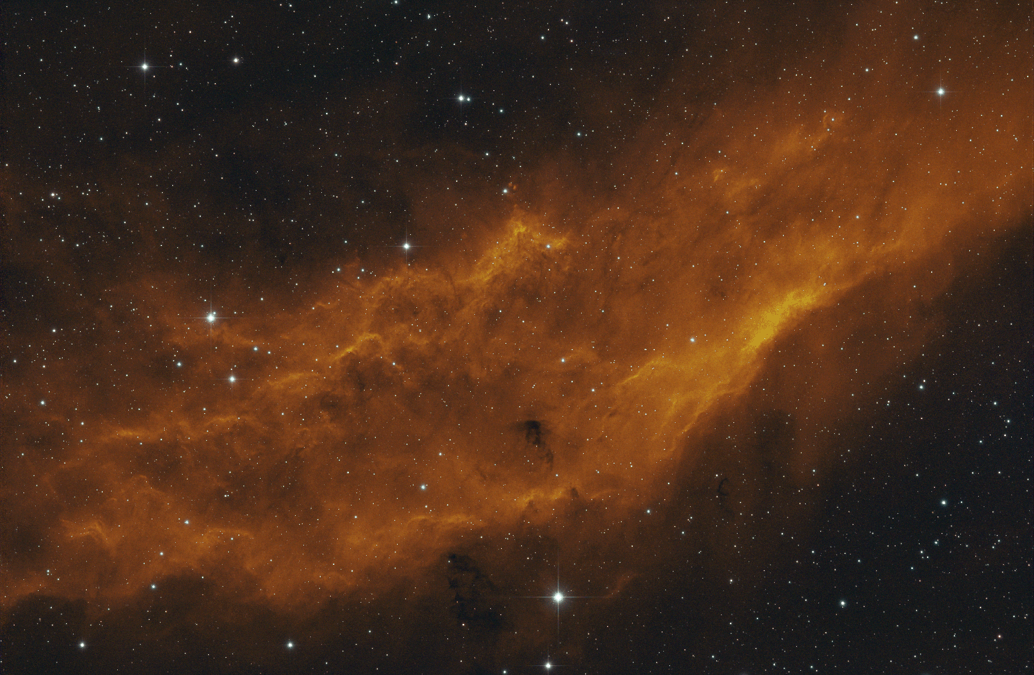 Bathed in golden light, this striking image of the California Nebula captures the cosmic waves of ionized gas sculpted by nearby stars, revealing the ethereal beauty and dynamic energy of our galaxy in vivid detail.