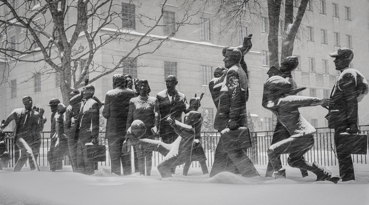 Life goes on in the community, unfazed by a blizzard. "Community" by sculptor Kirk Newman. Bronze. 2001