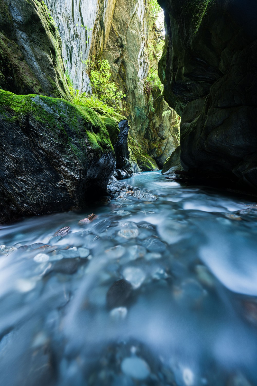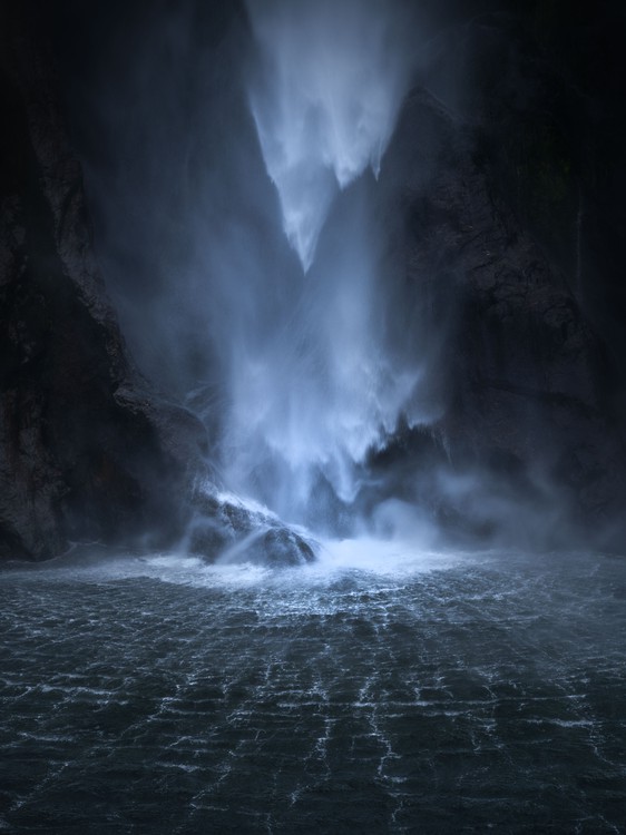 This image captures the sheer strength of a waterfall in a stormy weather. The waterfall pierces the rocks on which it falls below.