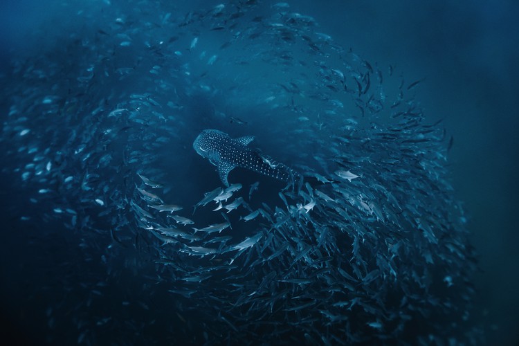 In the deep, motion finds its acenter – each life drawn into quiet harmony, the ocean breathing in balance.