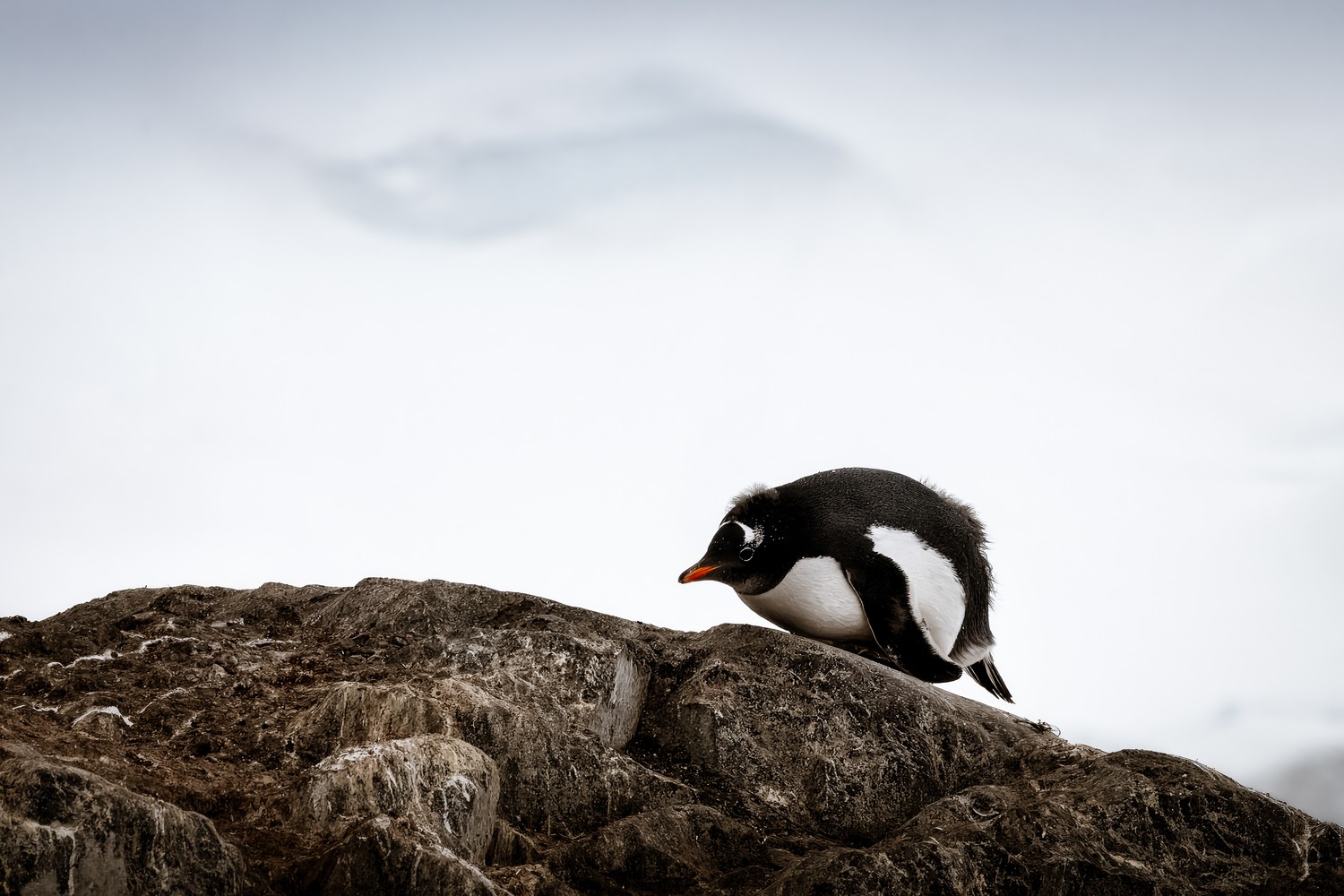 A loan guanaco poses in front of a misty Mt. Fitzroy in the late afternoon sun.