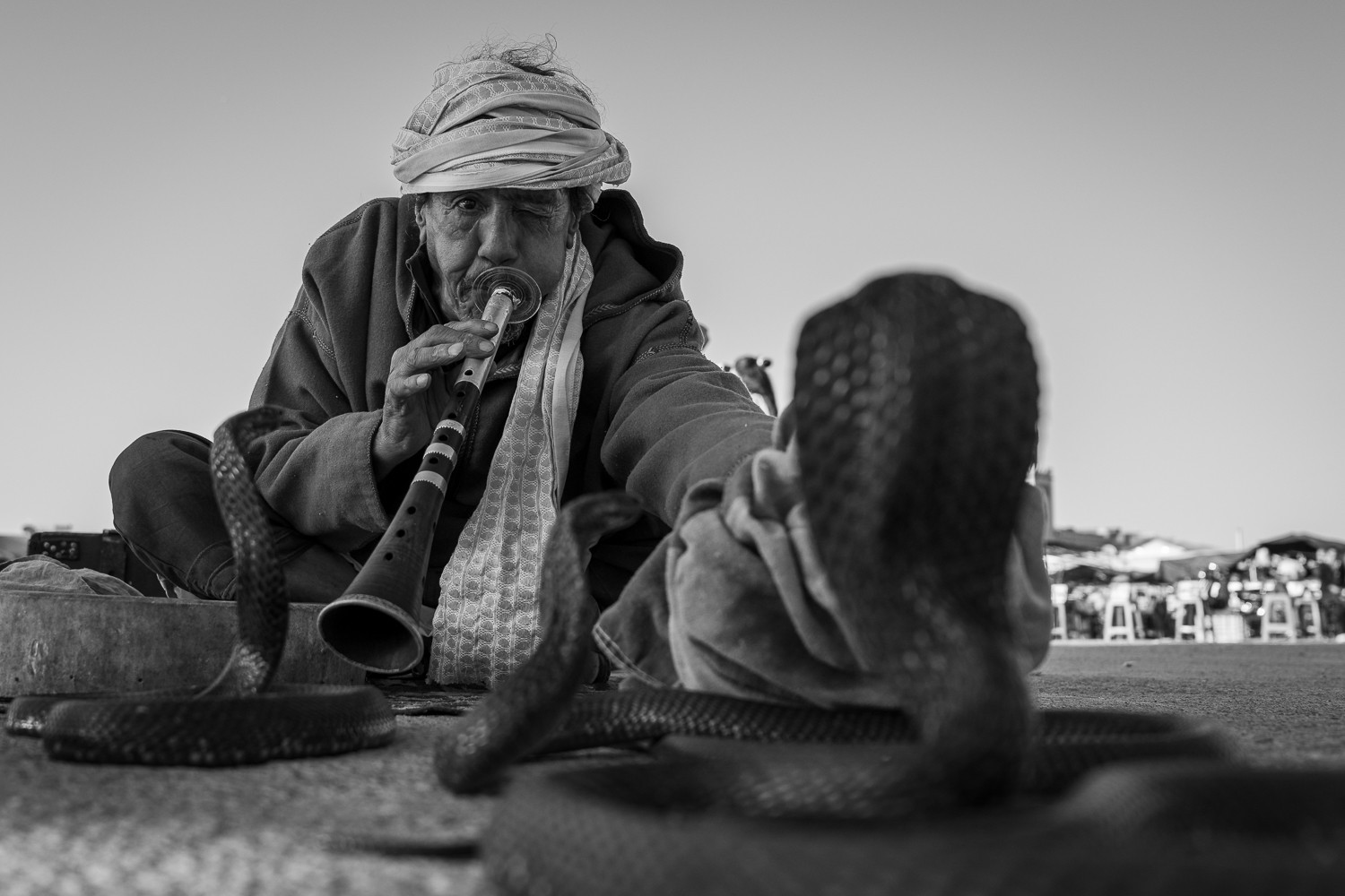 Photographed in Marrakech’s Jemaa el-Fnaa square. A snake charmer draws a cobra upward with the sound of his flute, the moment capturing a mix of tradition, performance and risk. Shot from ground level to place the viewer directly in the tension between man and serpent.