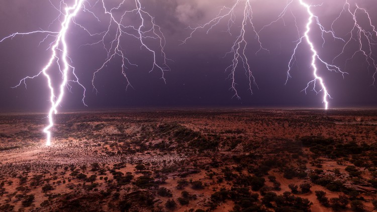 Lightening strikes hammer the red granites of outback Western Australia on the stroke of midnight, electrifying pitch black surrounds to life.