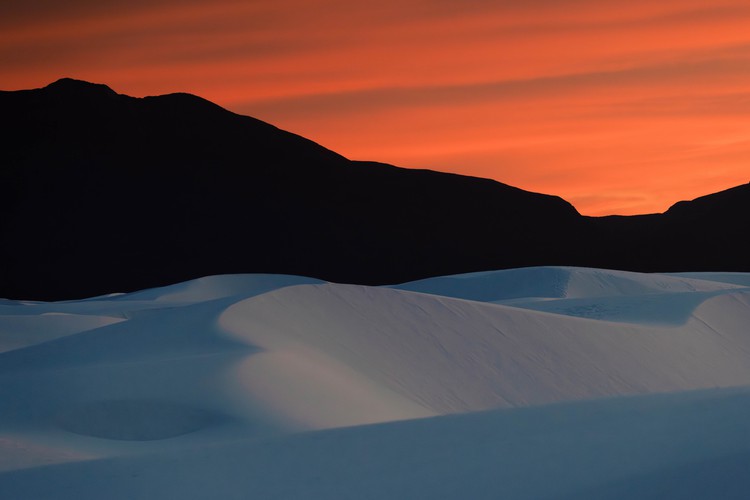 As darkness fell over the dunes, it was time to head home. The light was gone…the last of the photos taken—or so I thought. In a moment of serendipity, I turned after scaling the last high dune and watched in awe as the sky turned to fire over dunes dyed in blue.