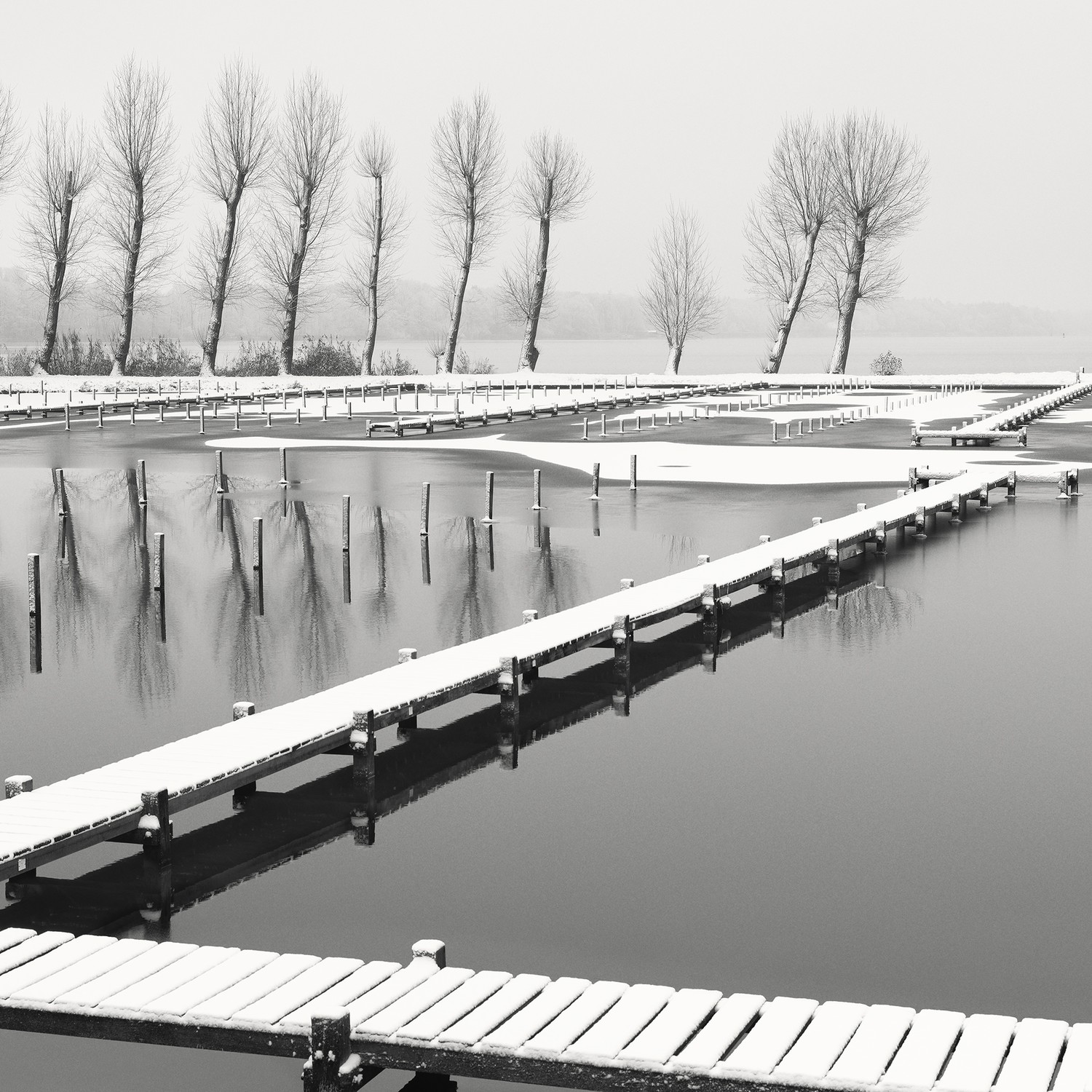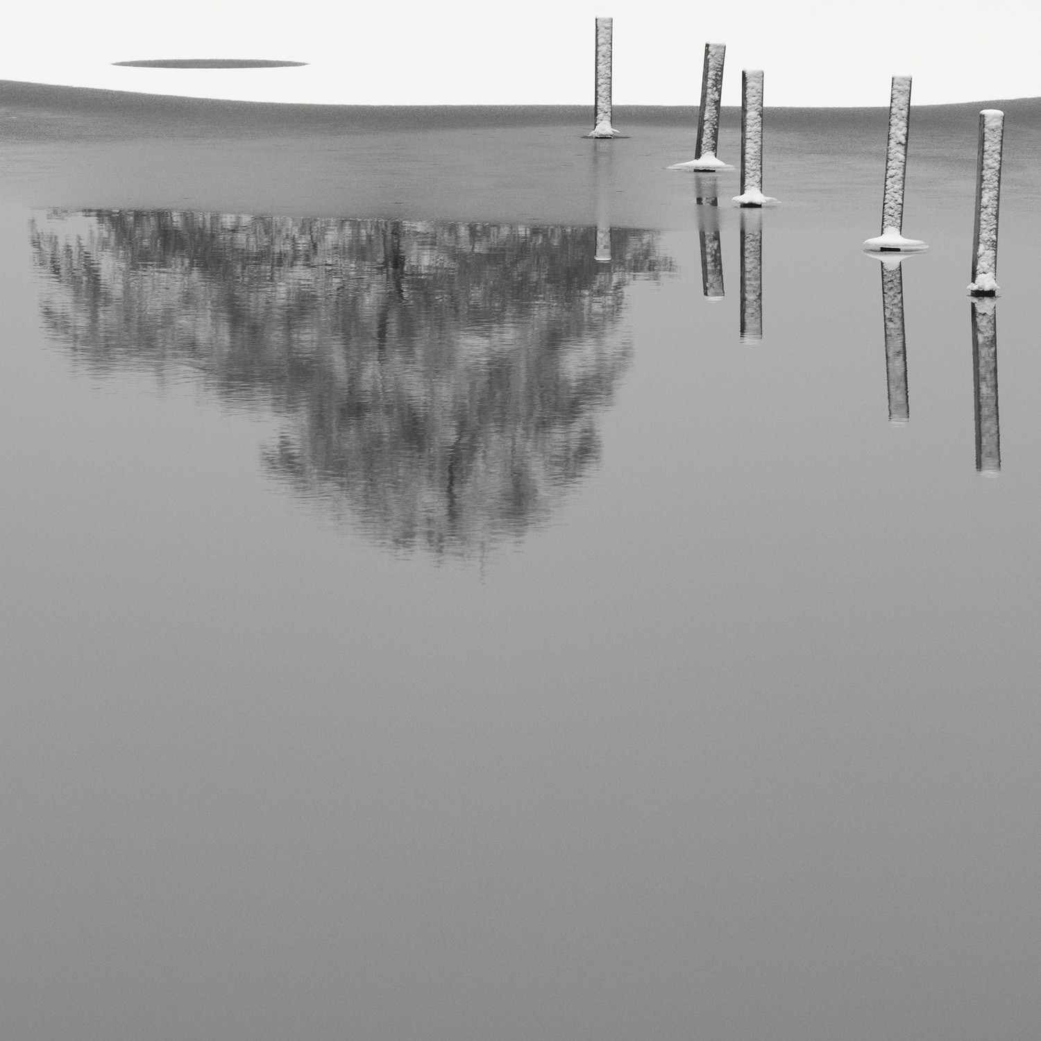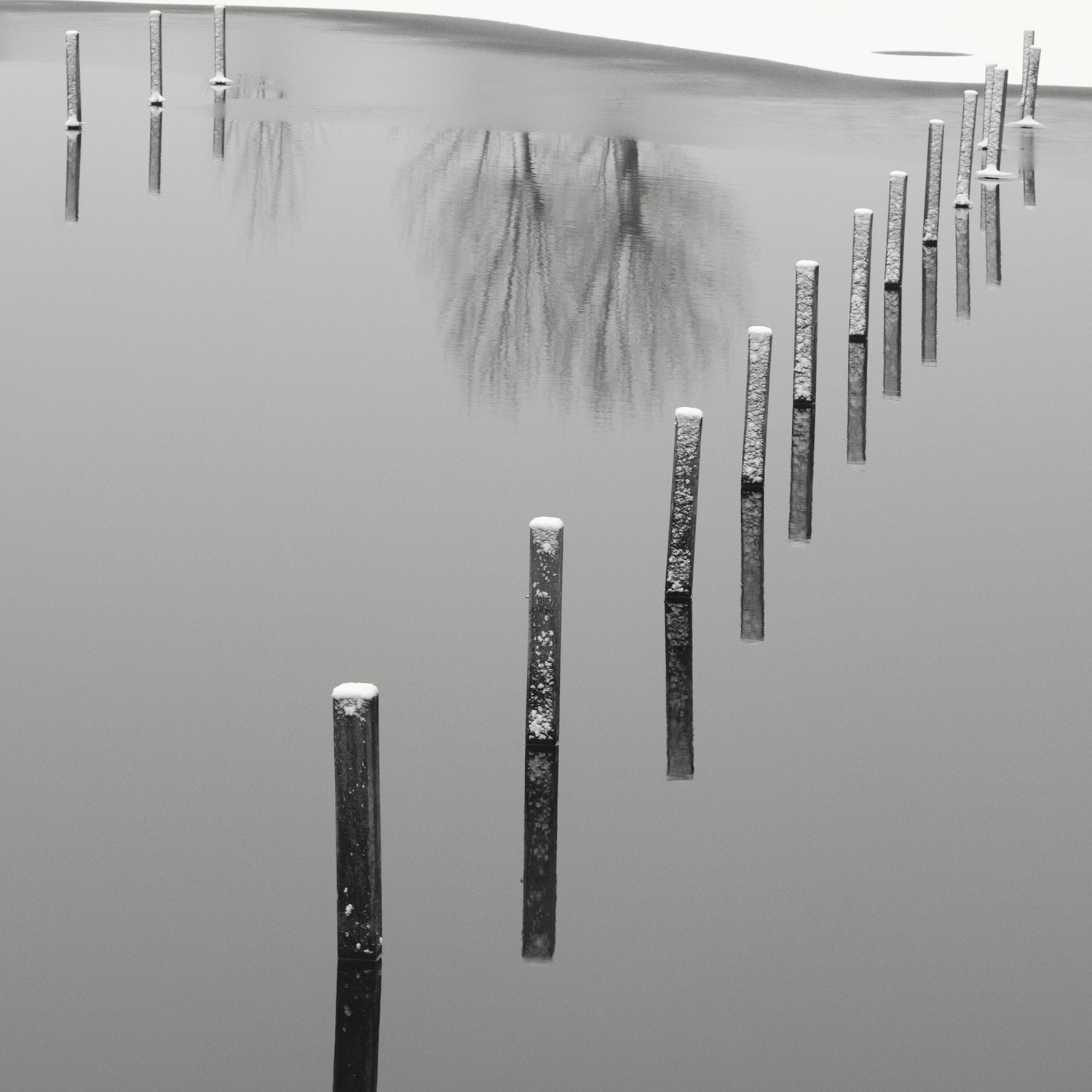 Serene, minimalist images of a boat dock blend with reflections of trees, all connected by wooden pylons that evoke the keys of an old piano. It is a symphony resounding in the winter silence.